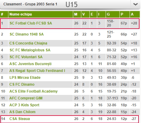 Mai jos vedeți cum arătă Clasamentul U16. FCSB are 2 meciuri mai puțin jucate.