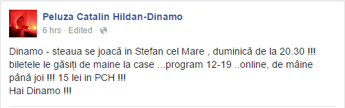 Comunicat: „FC Dinamo Bucureşti anunţă prin intermediul site-ului oficial al clubului că UNICUL DERBY al fotbalului românesc, contând pentru etapa XVIII-a din Liga 1, se va disputa duminică, 22 noiembrie 2015, la ora 20:30, pe stadionul din Ştefan cel Mare.”