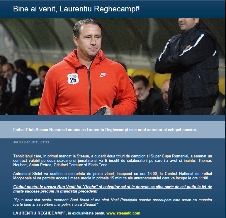 „Spun doar atat pentru moment: Sunt fericit si ma simt bine! Principala noastraă preocupare este acum sa muncim foarte bine si sa vorbim mai putin. Forza Steaua!”, a declarat Reghe.