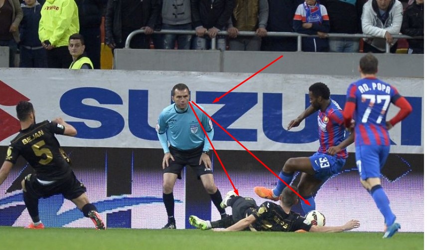 Bomba abia acum vine! E ipostaza halucinantă în care a fost surprins arbitrul adițional George Rădulescu. Acesta părea foarte concentrat la fază, dar cu toate astea nu a semnalat nimic arbitrului central George Găman !?! (ne)Cavalerul fluierului se uita ca curca-n lemne, de parcă urmărea prin iarbă un masaj erotic la furnici deranjate de minge.