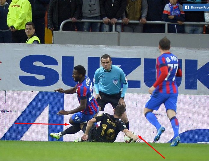 Asta am explicat si eu. Cea mai celebra comparatie e cea cu hentul lui Alaba. Nu e deloc la fel, acesta neavand de ales si fiind intr-adevar intr-o pozitie „naturala”. Sepsi a avut timp suficient sa-si retraga mainile langa corp. In fapt nu ai nici macar o simetrie. Bratul stang cel pe care se asaza, e tras langa corp, fiind in pozitia „pe coate”, iar cel drept se intinde suficient cat sa indice o oaresice intentie. Mai mult de atat, e suficient sa urmaresti capul lui Sepsi in imagini ca sa vezi iti dai seama ca privirea sta doar la arbitru, inca de cand a pornit alunecarea, stiind exact ca nu e tocmai regulamentar felul in care si-a intins bratul si denotand intentia de a obtura traiectoria balonului.