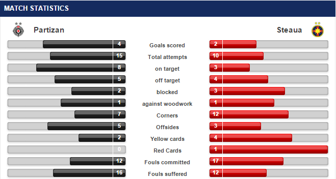 În Infernul de pe „Partizan Stadium” cu 30.000 de „ultrași”, Steaua a pierdut dramatic cu 4-2 și a spus adio la Champions League.  A prins, totuși, ultimul tren de UEFA, fiind trimisă de Paul Papp în play-off-ul de Europa League. Steaua iși afla adversarul la tragerea la sorti de vineri.