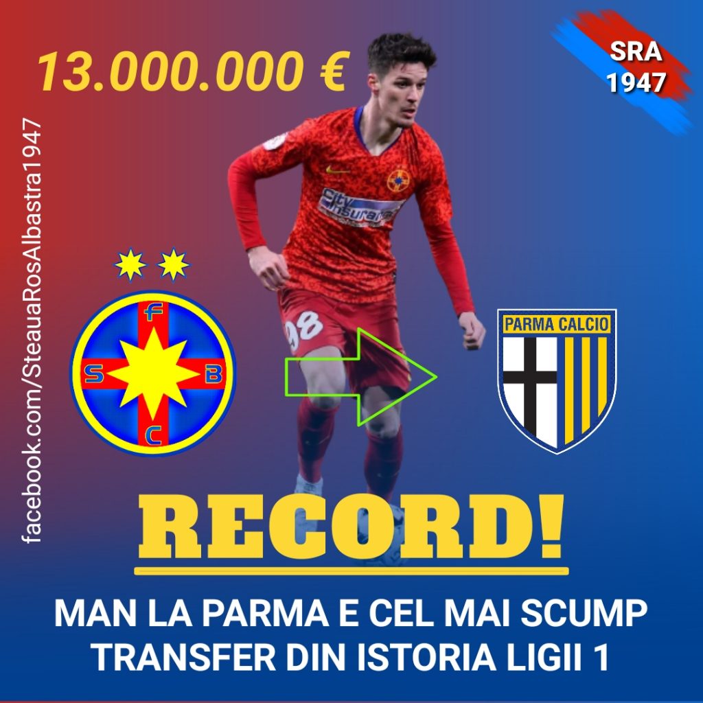 ?Steaua din Liga 1, prin transferul lui Dennis Man la Parma pentru 13 mil. €, stabilește un nou record în fotbalul românesc cu cel mai scump transfer din istorie. Precedentul record aparținea tot roș-albaștrilor cu 9,8 mil. € obținuți la transferul lui Nicolae Stanciu în 2016 la clubul belgian Anderlecht.
