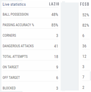 Poate părea surprinzător, dar Steaua a avut posesia, iar la indicii de performață a fost aproape de Lazio, nu la diferența de pe tabelă. (Statistică UEFA)
