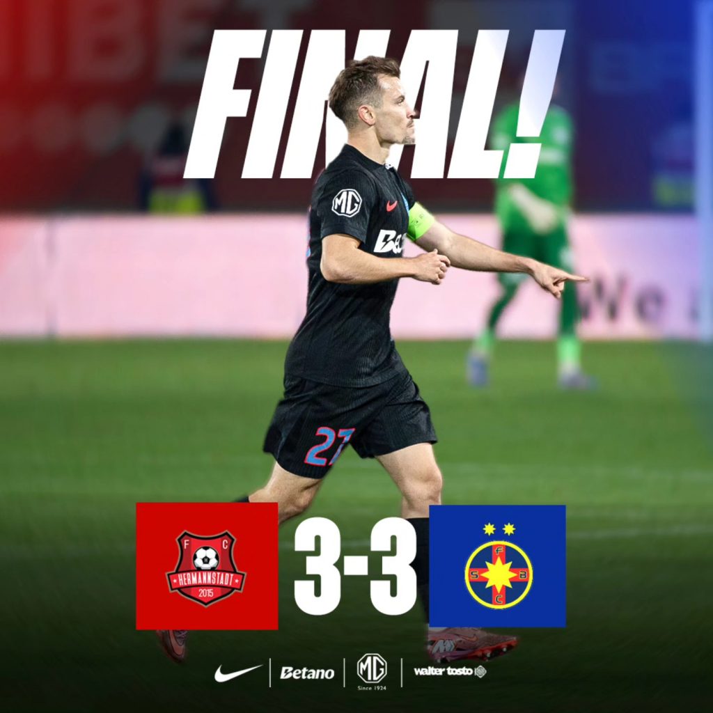 Meciul dintre Hermannstadt și FC Steaua s-a încheiat cu un spectaculos rezultat de egalitate, scor 3-3. Partida a oferit dramatism până în ultimele secunde de joc datorită răsturnărilor incredibile de scor.
