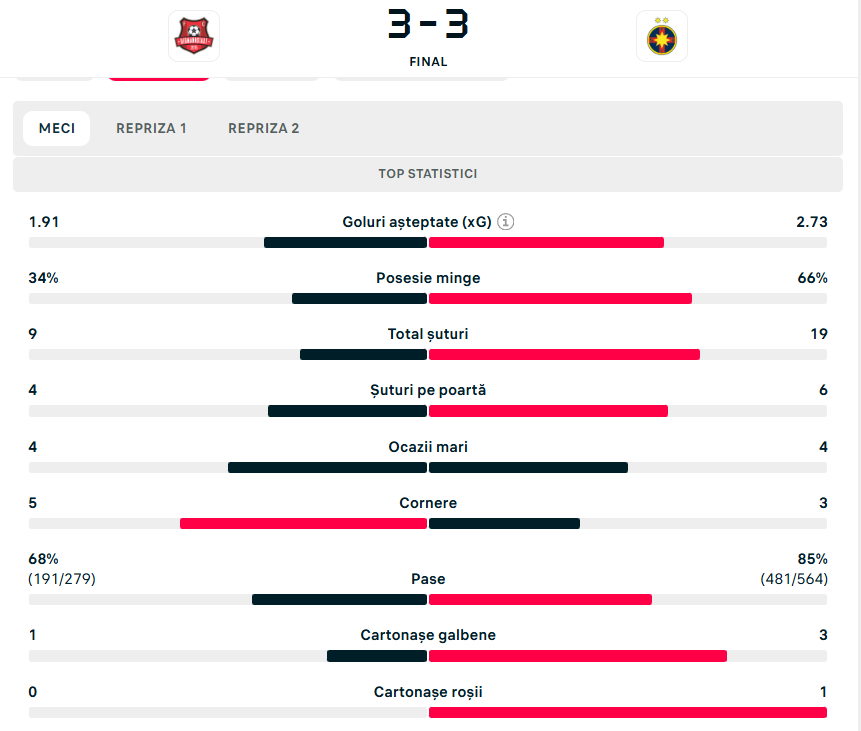 Campioana salvează un punct într-un meci pe care putea să îl câștige lejer, dar şi să îl piardă în mod stupid. Bine, semieșecul roș-albaștrilor nu poate fi atribuit în totalitate eliminării lui Bîrligea. În minutul 81 scorul era 2-2! Deci două goluri încasate de campioană, jucând 11 la 11 cu penultima echipă din clasamentul Superligii. Asta trebuie să dea de gândit.