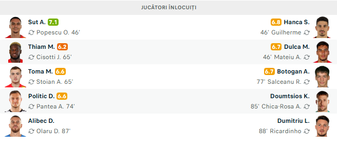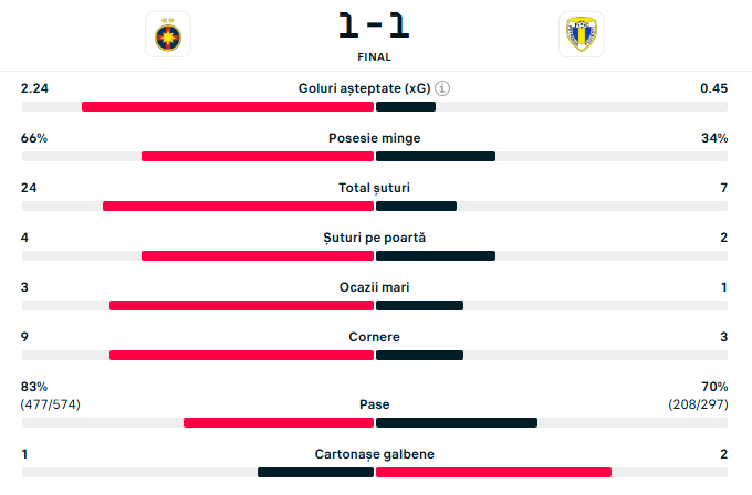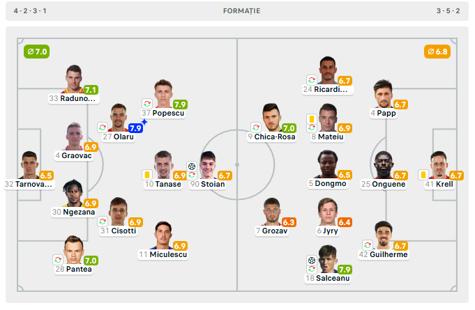 Notele individuale, acordate de Flashscore.ro, îi scot în evidență pe Darius Olaru și Tavi Popescu, ambii notați cu 7,9. Cinci roș-albaștri au fost apreciați cu note de la 7 în sus. Media campioanei a fost de 7, în timp ce Petrolul a bifat 6,8.