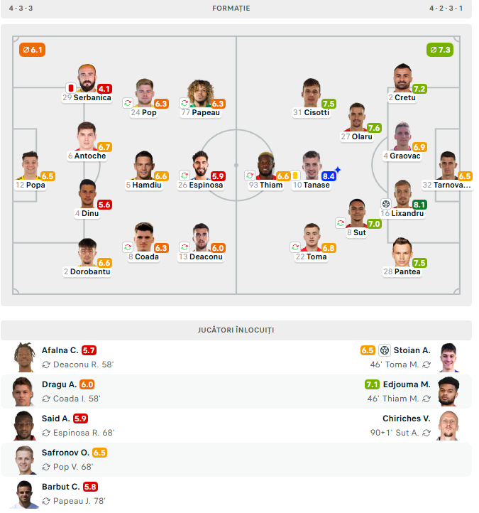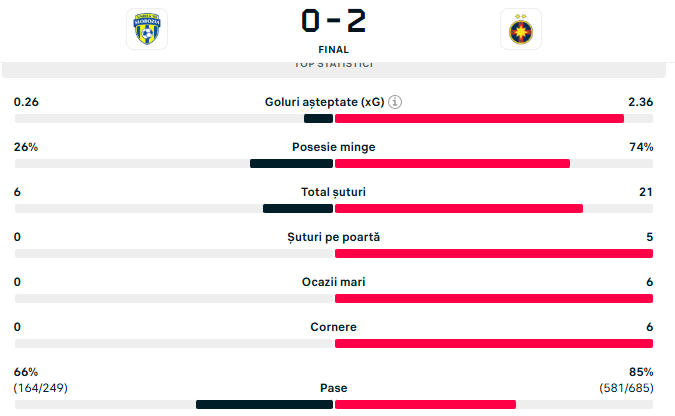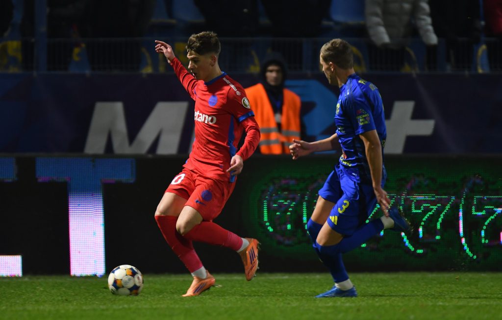 Steliștii au gestionat ritmul, au evitat riscurile inutile și au lovit din nou în prelungiri, stabilind rezultatul final. Alexandru Stoian a marcat golul de 0-2, minutul 90+5, chiar în ziua în care a împlinit 18 ani. Intrat după pauză, juniorul a irosit câteva ocazii mari: cap din careul mic, respins excelent de portar (52); șut în bară din apropierea punctului cu var (64); reluare pe lângă bară după ce Olaru i-a pasat în fața porții (90+2).