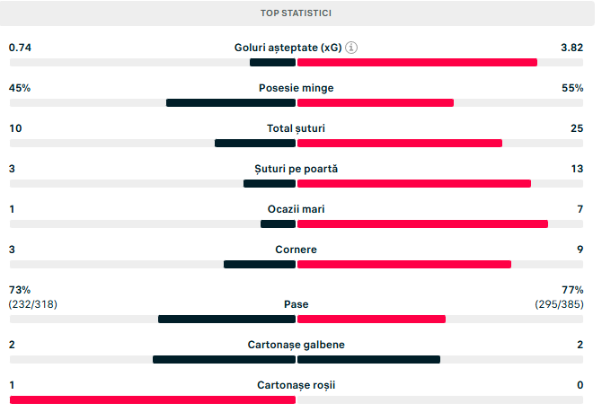 Profitând de spațiile largi din defensiva gălățenilor, steliștii s-au desprins decisiv pe tabelă. Faza ofensivă a funcționat bine, cu Tănase în rol de dirijor, iar diferența s-a mărit treptat până la 4-1, prin Olaru (66) și Tănase (79), pecetluind un succes clar.