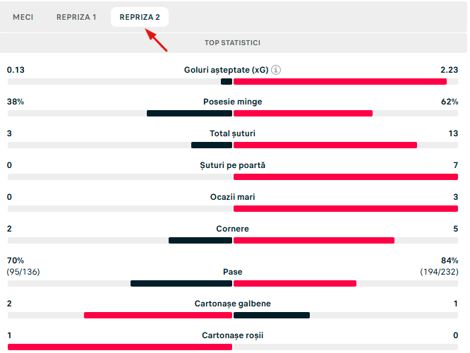 În minutul 54, Oțelul a rămas în inferioritate numerică după eliminarea lui Zivulic, în urma unui fault asupra lui Bîrligea. Cu un om în plus, roș-albaștrii au controlat aproape total jocul. La fel ca în prima repriză, campioana a dominat la capitolul ocazii și șuturi pe poartă, confirmând superioritatea arătată pe teren, în timp ce Oțelul nu a mai reușit să revină în joc după eliminare. Conform statisticii de pe site-ul Flashscore, dacă în prima repriză raportul șuturilor pe poartă a fost de 6-3 pentru roș-albaștri, în repriza secundă raportul a devenit 7-0! Ocaziile mari de gol au fost în favoarea steliștilor și în prima repriză (4-1), când se juca „11-11”, dar și în partea a doua a meciului (3-0), cu un om în plus.