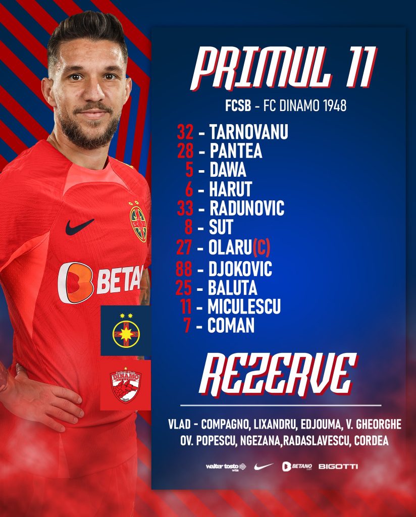 FCSB adica STEAUA: Târnovanu – Pantea, Dawa, Haruț, Radunovic – Olaru, Șut, Djokovic – Băluță, Miculescu, Coman.