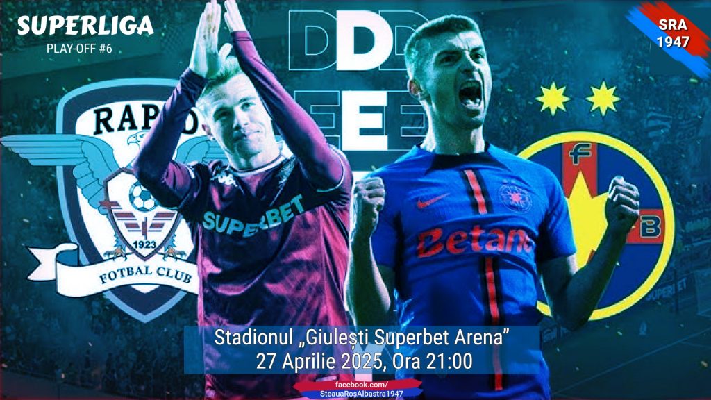 Returul Play-off-ului începe cu dueluri tari din etapa cu numărul 6 în Superligă. Derby-ul FC Rapid – FC Steaua se dispută pe stadionul „Giulești Superbet Arena”, duminică 27 aprilie 2025, de la ora 21:00.