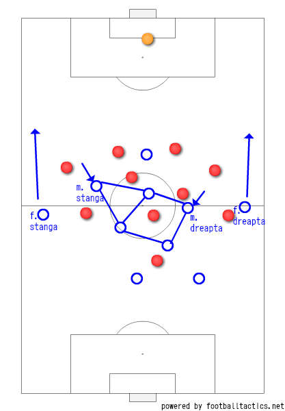 In fata unui oponent cu o mentalitate defensiva, care are centrul de greutate jos, mijlocasul dreapta clasic, precum Enache, este un model depasit. Am scris AICI despre asta. In principiu un nr zece, asadar tehnic si cu ultima pasa, care sa aibă piciorul de baza in interior, ar fi mai potrivit in lateral. Ar putea astfel sa intre intre linii, sa faca superioritate in centru, iar fundasul dreapta ar fi cel care s-ar ocupa de decongestionarea fluxului de joc.
