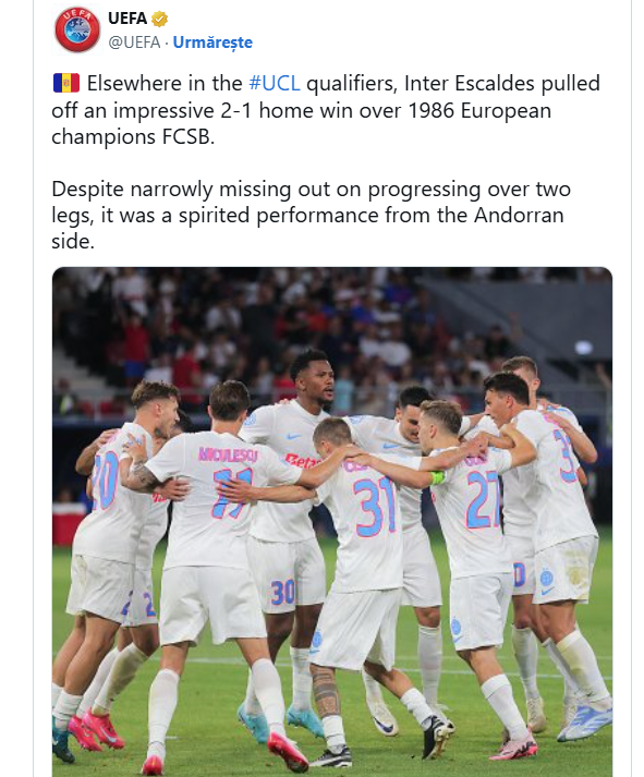 Astăzi, 15 iulie 2025, FC Steaua se va duela cu Inter d’Escaldes în returul primului tur preliminar din UEFA Champions League. Partida din Andorra se va disputa pe Estadi FAF din Encamp, care are o capacitate de 5.600 locuri și este programată la ora 21:30. Meciul se poate vedea în direct tot pe Antena 1.