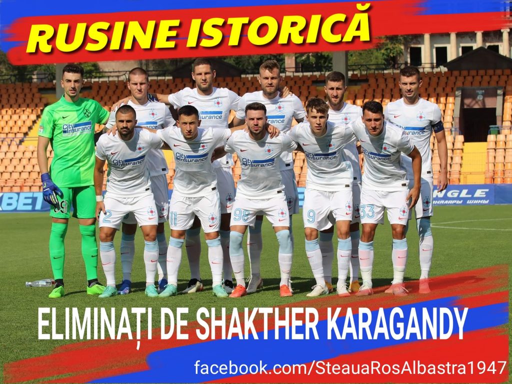 ⚽️??⬛O zi neagră pentru fotbalul din România!! Toate cele 3 echipe românești au fost eliminate rușinos din Conference League de echipe slab cotate… Roș-albaștrii antrenați de Dinu Tudoran și puși în teren de Gigi Becali, mai cu ghinion, mai cu prostie, s-au umplut de penibil, fiind eliminați „la 11m” de desculții de la Shakther Karagandy…