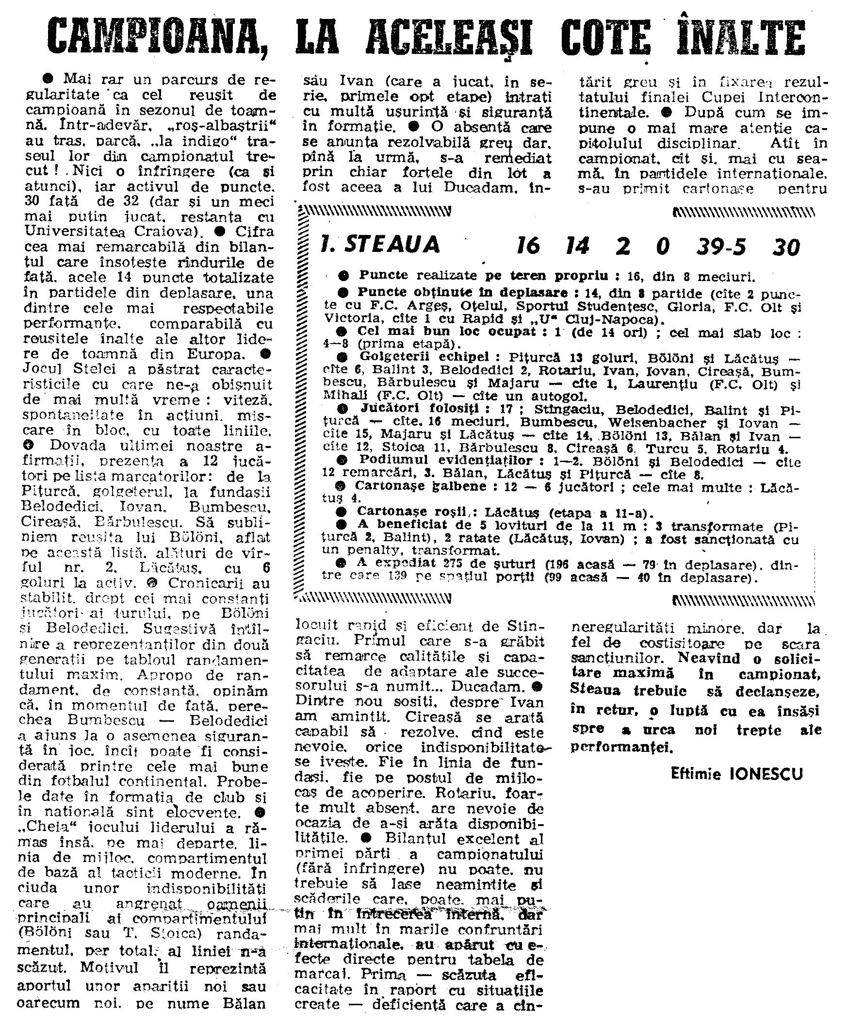 Supercupa Europei: STEAUA - Dinamo Kiev 1-0 VIDEODupa castigarea Cupei Campionilor Europeni, in urma finalei de la Sevilla, din 7 mai 1986, Steaua aborda sezonul 1986-1987 cu obiectivul clar de a-si confirma statutul castigat, atat prin continuarea si accentuarea dominatiei interne, cat si prin cucerirea celor doua trofee care se nasteau prin succesul cu 2-0 in fata Barcelonei.Cupa Intercontinentala, disputata la Tokyo, pe 14 decembrie 1986, a fost un meci special, pierdut in urma unei grave erori de arbitraj, care a anulat un gol regulamentar inscris de Belodedici, totul pe fondul jocului de un nivel superior practicat de militari in fata "milionarilor" de la River Plate si absentei lui Boloni. Dupa un tur de campionat de nivel calitativ optim in prima parte a sezonului 1986-1987, dar fara a excela, Steaua disputase Cupa Intercontinentala, meciul avand loc dupa ultima partida a turului de campionat. Principala noutate pentru acel sezon o constituia promovarea lui Emerich Jenei la echipa nationala (in ciuda dorintei exprimate de gloria CCA-ului, de a continua ca antrenor in Ghencea) si impunerea lui Anghel Iorandescu, o alta mare glorie a Stelei anilor `70, antrenorul (secund)-jucator de la Sevilla (si din ultimii doi ani), in functia de antrenor principal. Turul sezonului 1986-1987 adusese 14 victorii si 2 egaluri (cu Rapid si U Cluj) din 16 meciuri, golaveraj 39-5. Despartirea de Duchadam, fortat sa retraga din sportul de mare performanta, a fost suplinita excelent de tanarul Dumitru Stangaciu (folosit in toate cele 16 meciuri ale turului, alaturi de Belodedici, Balint si Piturca). Echipa era, in mare, aceeasi, cu Bumbescu, Weissenbacher si Iovan, cu 15 meciuri, Majaru si Lacatus, cate 14, apoi Boloni (13), Balan si nou-venitul Ivan (12), Tudorel Stoica (doar 11, din cauza unor probleme de sanatate), apoi Barbulescu (8), Cireasa (6), Viorel Turcu (5) si Rotariu, cu 4 meciuri. Lotul era in continuare, extrem de redus numeric. Tanarul Rotariu, venit ca fundas stanga, se impunea cu greu in fata lui Weissenbacher, care (promovat cu asiduitate de Iordanescu) ii luase fata titularului din sezonul de aur, Ilie Barbulescu. Nou-venitii Cireasa (fundas sau mijlocas dreapta) si Ivan (mijlocas central) se pare ca nu lasasera o impresie proasta, in prima parte a campionatului, dar istoria ne arata ca nu s-au putut impune la nivelul asteptarilor. Revenirea atacantului Viorel Turcu, care mai jucase la Steaua, apoi fusese dat la schimb la Dinamo, trebuia sa acopere plecarea "sarpelui" Marin Radu II, un atacant de mare cota in epoca, cu cel putin o clasa peste Turcu. Deci, aici era un minus mare. Peste asta, excluderea lui Stefan Petcu, un mijlocas ofensiv coordonator - de geniu - din lotul Stelei, in toamna lui 1985, nu fusese suplinita nici ea, tanarul Pistol, pe banca la Sevilla, fiind indepartat, caci nu se apropia - macar - de anvergura Stelei. Rotariu avea potential, dar nu se putea impune in fata cuplului Boloni-Tudorel Stoica, nejucand decat 4 meciuri. Tragand linie, daca la Sevilla Steaua a avut 4 rezerve de camp - Weissenbacher, Pistol, Radu II si Iordanescu - prin absenta lui Tudorel Stoica, care l-ar fi trimis pe banca si pe Lucian Balan (un jucator-furnica, foarte util, care acoperea toate posturile de la mijloc, prin energie, vitalitate si rezistenta), vedem, de fapt, ca Steaua, la Sevilla, a vut o singura rezerva care ar fi putut insemna ceva: pitesteanul Marin Radu II, dublu golgheter al Romaniei, la Pitesti. Weissenbacher nu ar fi intrat decat in caz de accidentare a unui titular, Pistol nu era jucator nici macar de prima jumatate in Romania, fiind adus in iarna lui `86, iar Iordanescu nu mai era jucator activ de 3 ani. Steaua se bazase pe 13 jucatori, titularii din meciul cu Anderlecht, adica Duchadam - Iovan, Belodedici, Bumbescu, Barbulescu - Balint, Stoica, Boloni, Majaru - Lacatus, Piturca, carora li se adaugau Radu II si Balan. Atat! La inceputul campaniei mai era si Fane Petcu, dar el disparuse. Asadar, la saracia lotului din campania Sevilla, Steaua nu numai ca nu a produs imbunatatiri, dar a scazut ca nivel, prin plecarea lui Radu II si aducerea lui Turcu, in locul sau. Practic, nu existau variante in momentul unei accidentari sau suspendari. Ivan si Cireasa nu erau de Steaua, iar Rotariu (destul timp si accidentat, insa) nu putea juca in fata cuplului Stoica-Boloni. Astfel, absenta lui Boloni, la Tokyo, a cantarit urias. Pana atunci, in turul II al Cupei Campionilor, sezonul 1986-1987, Steaua a intalnit-o pe Anderlecht, invinsa din primavara aceluiasi an. Primul meci a fost abordat cu celebrii Nita Cireasa si Toma Ivan, titulari la mijlocul terenului, la doar cateva luni de la Sevilla. Absenta lui Boloni, de la mijloc, si a lui Lacatus, din atac (ambii suspendati, pentru primul meci) nu au putut fi acoperite decat prin carpeli, adica prin avansarea lui Balint, ca varf, langa Piturca, si trecerea lui Cireasa ca mijlocas dreaptam iar in locul lui Loti, a intrat Ivan. Peste astea, absenta lui Bumbescu (si el suspendat) l-a trecut pe Iovan la marcaj, si a mai determinat doua permutari, pe Barbulescu in locul lui Fane, ca fundas dreapta, si pe Toni ca fundas stanga. Asadar, fata de "campania Sevilla", erau nu mai putin de 6 posturi modificate, prin doar 3 absente, ceilalti jucatori trebuind a fi mutati pentru a gestiona - cat de cat - absentele. Portarul, fundasul dreapta, fundasul de marcaj, mijlocasul dreapta, mijlocasul defensiv si atacantul dreapta erau DIFERITI. Mai adaugam si scaderea vizibila de forma a lui Majaru (tinut la suprafata de clasa sa) si avem un tablou complet. Rezumand, sezonul care a urmat castigarii CCE a inceput foarte prost, Steaua fiind eliminata din prima mansa (turul II) al CCE, de Anderlecht, din cauza ca nu avea un lot care sa suplineasca 3 absente. In campionat, Steaua a defilat, avand de partea sa un nuceu de 12-13 jucatori care, prin valoare si experienta, dominau celelalte competitoare. In campionat, absentele cauzate de accidentari si eliminari pu