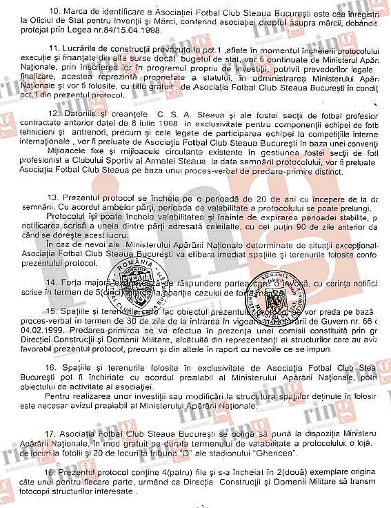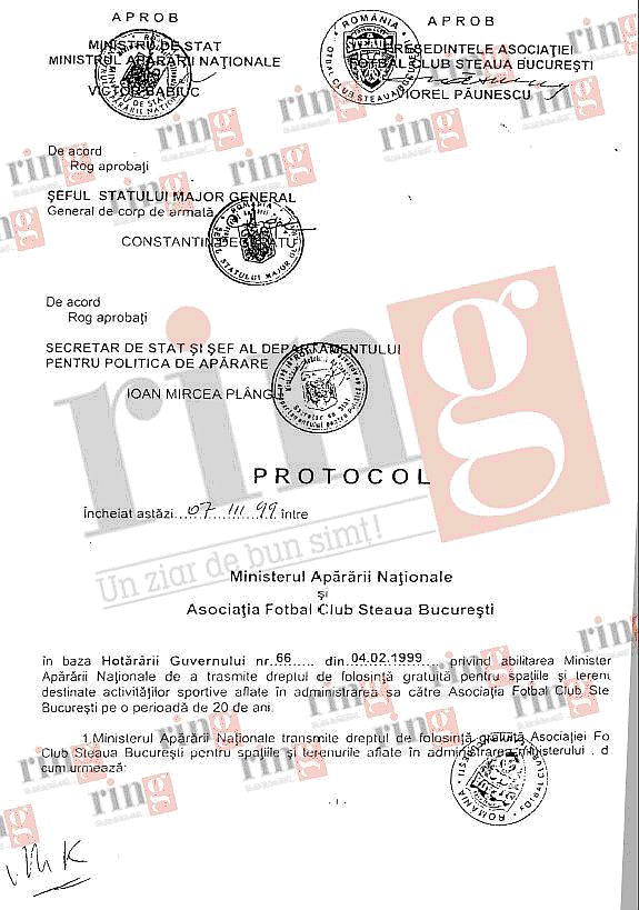 Steaua - de la MApN la Becali (6)Recompensând măreţele realizări ale Administraţiei Viorel Păunescu, care a îngropat clubul în contraperformanţe fără precedent, onor Ministerul Apărării Naţionale hotărăşte, prin Protocolul din 7 martie 1999, bazat pe Hotărârea de Guvern nr. 66 din 4 februarie 1999 a „transmite dreptul de folosinţă gratuită pentru spaţiile şi terenurile destinate activităţilor sportive aflate în administrarea sa către Asociaţia Fotbal Club Steaua pe o perioadă de 20 de ani”.![]() ![]() De remarcat punctele 11, 12 şi 16 ale Protocolului, dar – mai ales – punctul 10. (...) 10. Marca de identificare a Asociaţiei Fotbal Club Steaua este cea înregistrată la Oficiul de Stat pentru Invenţii şi Mărci, conferind Asociaţiei dreptul asupra mărcii, dobândit şi protejat prin Legea nr. 84/15.04.1998 11. Lucrările de construcţie prevăzute la pct. 1, aflate în momentul încheierii protocolului îm execuţie şi finanţate din alte surse decât bugetul de stat, vor fi continuate de Ministerul Apărării, prin înscrierea prin înscrierea lor în programul propriu de investiţii, potrivit prevederilor legale. Odată finalizate, acestea reprezintă proprietate a statului, în administrarea Ministerului Apărării Naţionale şi vot fi folosite, cu titlu gratuit, de Asociaţia Fotbal Club Steaua pe baza unui proces-verbal de predare-primire distinct. 12. Datoriile şi creanţele CSA Steaua şi ale fostei secţii de fotbal profesionist contractate anterior datei de 8 iulie 1998 în exclusivitate pentru componenţii echipei de fotbal, tehnicieni şi antrenori, precum şi cele legate de participarea echipei la competiţiile interne şi internaţionale, vor fi preluate de Asociaţia Fotbal Club Steaua în Baza unei convenţii separate. Mijloacele fixe şi mijloacele circulante existente în gestiunea fostei secţii de fotbal profesionist a clubului sportiv al Armatei Steaua la data semnării protocolului, vor fi preluate de Asociaţia Fotbal Club Steaua pe baza unui proces-verbal de predare-primire distinct. (...) 16. (...) Pentru realizarea unor investiţii sau modificări la structura spaţiile deţinute în folosire este necesar avizul prealabil al Ministerului Apărării Naţionale. 17. Asociaţia Fotbal Club Steaua Bucureşti se obligă să pună la dispoziţia MApN, în mod gratuit pe durata termenului de valabilitate: a protocolului o lojă, (indescifrabil) de locuri la fotolii şi 20 de locuri la Tribuna „0” ale stadionului „Ghencea”. APROB APROB Ministru de Stat Preşedintele Asociaţiei Preşedintele Asociaţiei Ministerul Apărării Naţionale Fotbal Club Steaua Bucureşti (ss) VICTOR BABIUC (ss) VIOREL PĂUNESCU De acord Rog aprobaţi Şeful Statului major General General de corp de armată (ss) CONSTANTIN DEGERATU De acord Rog aprobaţi Secretar de Stat şi Şef al Departamentului Pentru Politica de Apărare (ss) IOAN MIRCEA PLÂNGU Iată şi textul Hotărârii de Guvern, care se referea, în titlu, la „transmiterea în folosinţă gratuită a unui imobil situat în municipiul Bucureşti.” HOTĂRÂRE Nr. 66 din 4 februarie 1999 privind transmiterea în folosinţă gratuită a unui imobil situat în municipiul Bucuresti ACT EMIS DE: GUVERNUL ROMÂNIEI ACT PUBLICAT ÎN: MONITORUL OFICIAL NR. 55 din 8 februarie 1999 Guvernul României hotărăşte: Art. 1 Se aprobă transmiterea imobilului, identificat conform datelor din anexa care face parte integrantă din prezenta hotărâre, din administrarea Ministerului Apărării Nationale, în folosinţă gratuită, pe o perioada de 20 de ani, Asociaţiei Fotbal Club "Steaua" Bucureşti. Art. 2 (1) Transmiterea imobilului prevăzut la art. 1 se face pe bază de protocol încheiat între Ministerul Apărării Naţionale şi Asociaţia Fotbal Club "Steaua" Bucureşti. (2) Protocolul cuprinde şi obligaţiile ce revin Asociaţiei Fotbal Club "Steaua" Bucureşti în legatură cu folosinţa imobilului transmis. PRIM-MINISTRU RADU VASILE Contrasemnează: Ministru de stat, Ministrul Apărării Naţionale, Victor Babiuc Ministrul Finanţelor, Decebal Traian Remeş Ministrul Tineretului şi Sportului, Crin Antonescu ANEXA 1 DATELE DE IDENTIFICARE a imobilului aflat în administrarea Ministerului Apărării Naţionale, care se transmite în folosinţă gratuită Asociaţiei Fotbal Club "Steaua" Bucureşti ------------------------------------------------------------------------------ Caracteristicile tehnice ale imobilului Locul unde este situat: Bucureşti, bd Ghencea nr. 45, sectorul 6 ------------------------------------------------------------------------------ 1. Stadionul Ghencea, compus din: Tribună oficială, Tribuna I, Tribuna a II-a, Peluza 1, Peluza 2 Parcările de la tribuna oficiala – suprafaţă construită = 12.318 mp – suprafaţa terenului = 37.700 mp 2. Terenuri de antrenament (nr. 4, 5, 6 si 7) - suprafaţă = 33.825 mp 3. Teren de minifotbal - suprafaţă = 4.032 mp 4. Terenul dintre tribuna I si Fabrica de Confecţii, adiacent parcării - suprafaţă = 34.390 mp 5. Parcări betonate - suprafaţă = 9.275 mp 6. Garaj din tablă ondulată - suprafaţă construită = 130 mp 7. Clădirea Centrului de Copii şi Juniori - parţial - suprafaţă = 531 m (2/3 din clădire) 8. Baza hipică - suprafaţă construită = 5.284 mp - suprafaţa terenului = 75.000 mp ------------------------------------------------------------------------------ TOTAL: Suprafaţă construită = 27. 538 mp Suprafaţa terenului = 194. 222 mp Filip Pindean BIBLIOGRAFIE OBLIGATORIE: Steaua - de la MApN, la Becali (1) Steaua - de la MApN, la Becali (2) Steaua - de la MApN, la Becali (3) Steaua - de la MApN, la Becali (4) Steaua - de la MApN, la Becali (5) FCSTEAUA.RO este un site deschis, facut de suporteri, pentru suporteri. Asteptam articolele scrise de voi, daca aveti ceva de spus si credeti ca o puteti face intr-un articol, nu ezitati!