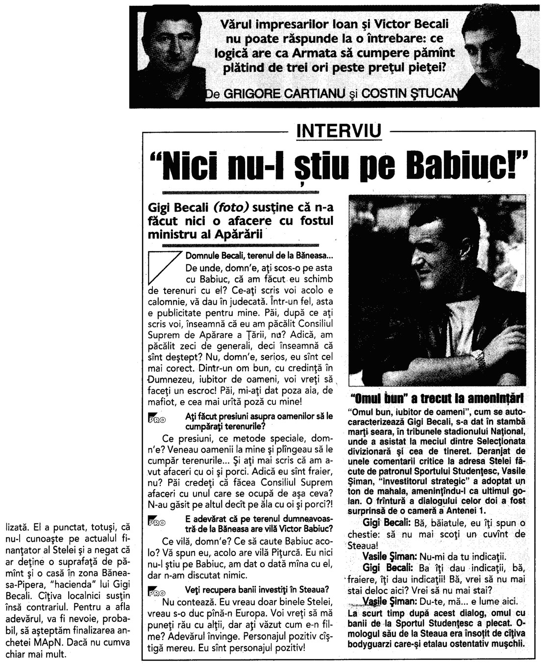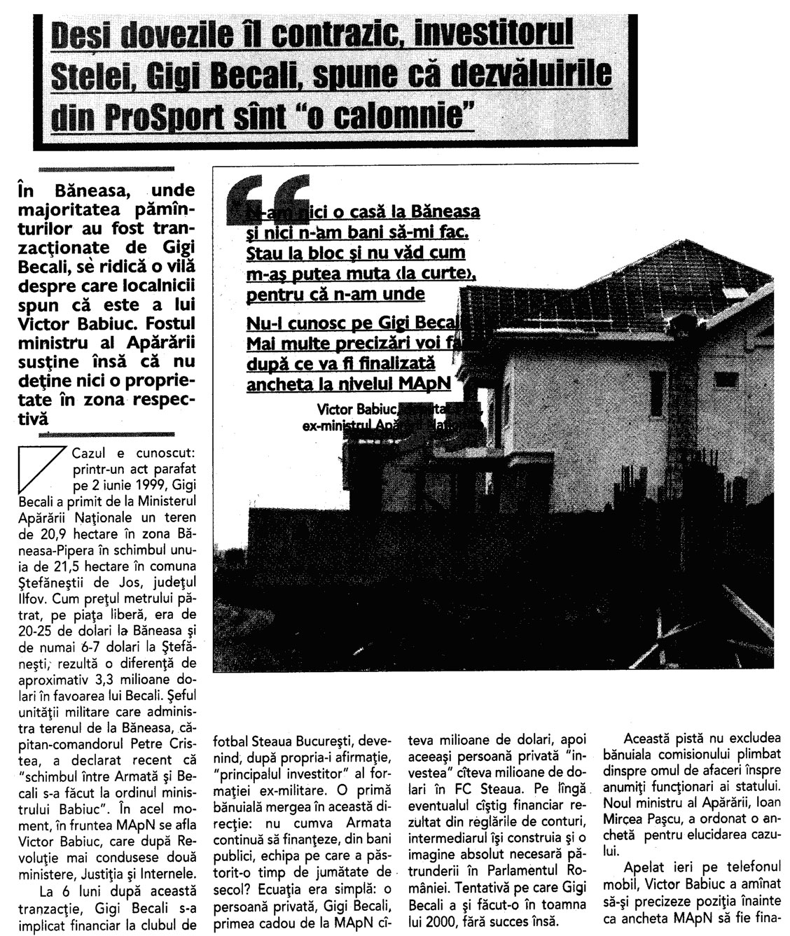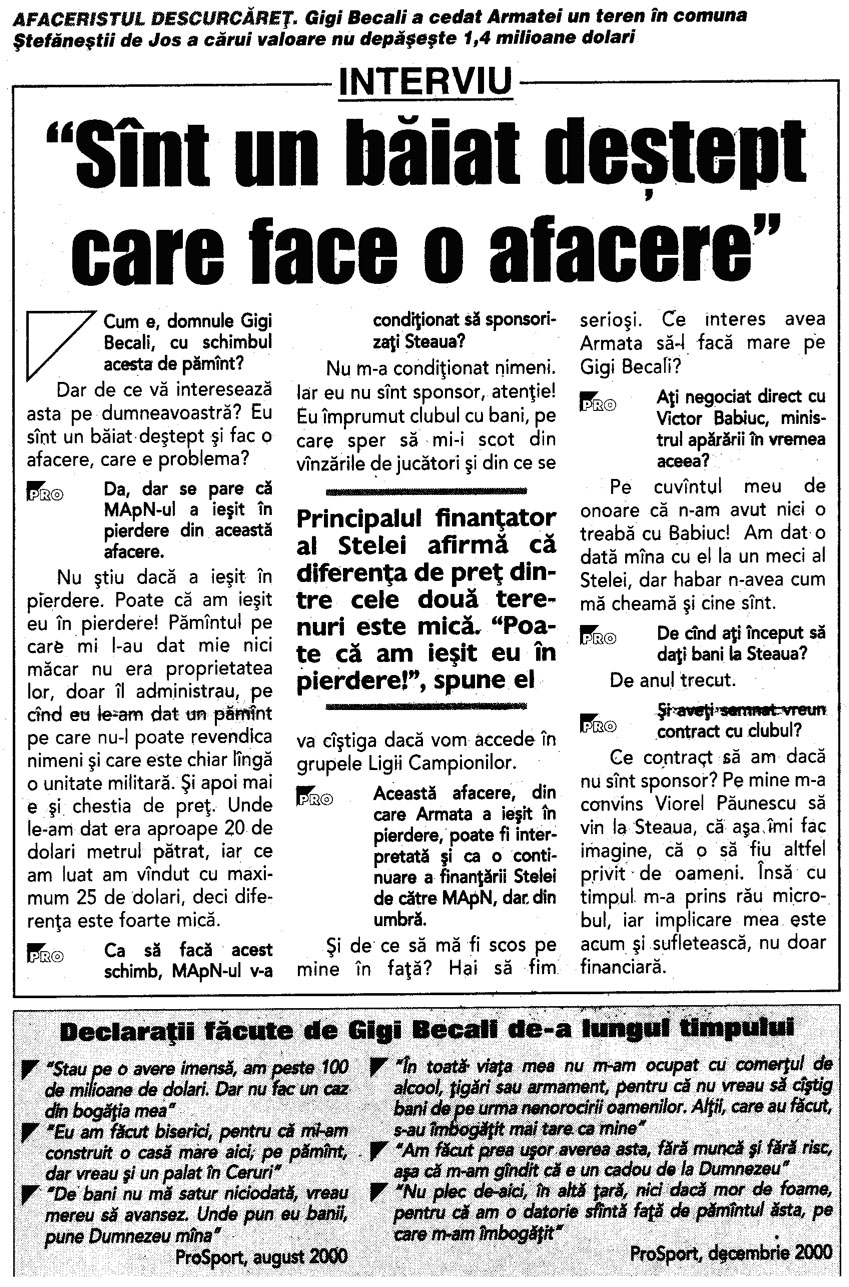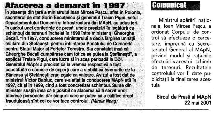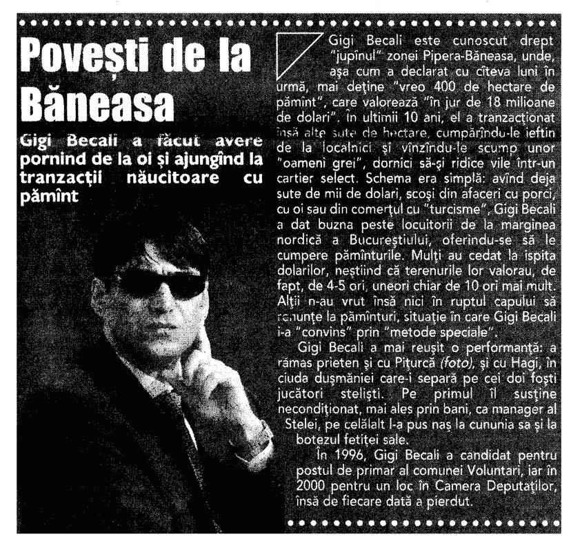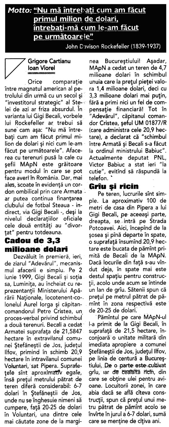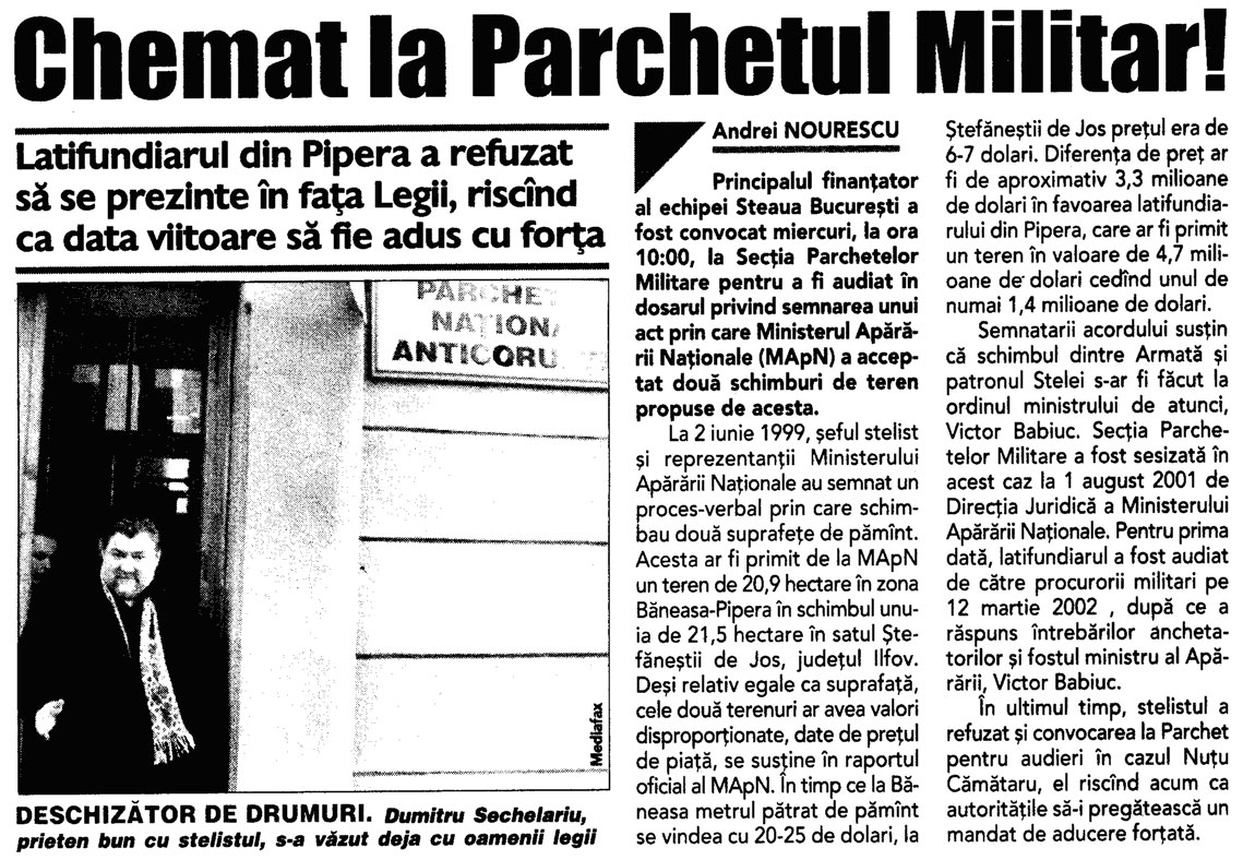 Steaua - de la MApN, la Becali (7)1) In anul 1996, prin semnatura generalului Dumitru Cioflina, seful Marelui Stat Major General al Armatei, George Becali a primit de la MApN peste 85.000 mp in Pipera. MApN a primit la schimb un teren in Stefanesti, langa o unitate militara, desi nu avea nevoie de acel teren deoarece nu avea cuprins in buget nici un proiect de constructii in zona respectiva. Becali a achizitionat terenul din Stefanesti de la cei improprietariti de catre primarul Rababoc, cumnatul generalului Cioflina.2) In ianuarie 1997, presedintele Emil Constantinescu, in cadrul unei sedinte CSAT, a aprobat, in principiu, realizarea unei constructii pentru MApN in Stefanesti, unde deja se consumase primul schimb cu Becali. 3) 10 octombrie 1997, Ministerul Agriculturii a avizat un schimb de terenuri intre MApN si SCAI Mogosoaia. Din cei 70.000 de metri patrati, predati de Ministerul Apararii, o parte importanta a ajuns tot in posesia familiei Becali. 4) 17 octombrie 1997, presedintele Emil Constantinescu a primit de la SCAI Mogosoia 25.000 de metri patrati, revendicati de familia sa 5) In anul 1998, George Becali a inaintat catre MApN o propunere de schimb. A oferit 210.000 de metri patrati in Stefanesti si a cerut la schimb 200.000 de metri patrati in Pipera. La acea data, cand a facut propunerea, Becali nu era proprietarul terenului din Stefanesti pe care il oferea la schimb. A facut actele de cumparare abia dupa ce conducerea MApN a avizat schimbul, desi terenurile erau revendicate. 6) Abia in anul 1999, s-au semnat actele de schimb intre „permutantul” MApN si „copermutantii” George si Luminita Becali. 7) In anul 2007, DNA a preluat anchetarea penala a schimburilor de terenuri dintre MApN si George Becali, fiind vizati, intre altii, generalii Dumitru Cioflina, Constantin Stanasila si fostul ministru al Apararii Victor Babiuc. passim: lumeajustitiei „In urma cu 9 ani, in 17 ianuarie 2001, Sectia Parchetelor Militare s-a sesizat cu privire la doua schimburi de terenuri realizate intre Ministerul Apararii Nationale si Gigi Becali. Un an si jumatate mai tarziu, in 2002, Camera Deputatilor-Comisia pentru Cercetarea Abuzurilor a sesizat Parchetul Inaltei Curti cu privire la savarsirea unor abuzuri in zona Baneasa si nelegalitatea schimburilor de terenuri intre MApN si Becali. Mai multe persoane care revendicasera terenurile din zona se poticnisera in acest transfer, fiind vorba de afaceristul Becali, acesta creand aparenta de proprietar de buna credinta dupa ce suprafetele de teren revendicate fusesera transmise in mod SUCCESIV.” (10 noiembrie 2010) In 2006, Grigore Nicolae, unul dintre oamneii care revendicau o bucata din aceste suprafete a facut plangere impotriva lui Becali, considerandu-se prejudiciat cu 1,25 milioane dolari, diferenta de valoare intre terenul la care era indreptatit si cel primit, care era de fapt o groapa de gunoi. Au urmat si plangerile altor persoane prejudiciate. Prin Raportul nr. A 393 din 9 februarie 2001, MApN, prin Serviciul Directiei de Audit Intern a aratat in legatura cu schimburile de teren in discutie ca in cazul acesta “nu s-a putut justifica nici oportunitatea si nici eficienta”. Toate documentele au fost inaintate la Parchet. La dosarul 194/P/2007 a fost conexata si disjungerea din din dosarul 231/P/2007 cu privire la aceste schimburi de terenuri, dar si cu privire la modul fraudulos de achizitionare a Fermei IAS Mogosoaia. ”Nelegalitatea transferurilor de terenuri din zona Baneasa, respectic Otopeni, abuzurilor Comisiilor Locale de aplicare a legilor fondului funciar si ale functionarilor OCAOTA au fost sesizate si de alte institutii, unele cu atributii de control”, se arata in rechizitoriu. In 2001, prim-ministrul Adrian Nastase a decis sa trimita echipa Corpului de Control ca sa faca verificari legate de acest subiect, actul de control avizat de Victor Ponta, sef al Corpului de Control la acea vreme, se subliniaza ca la acea data, in administrarea MApN se aflau 222, 9 ha in zona aeroportului Baneasa si 177, 1 in zona Aeroportului International Otopeni. “Un caz special il constituie terenurile apartinand comunei Voluntari in care, neexistand terenuri agricole de productie, punerile in posesie au fost realizate de Comisiile de fond funciar ale comunelor Tunari, Stefanesti, Dobroesti si Mogosoaia (...) se atrage atentia cu privire la faptul ca instrainarea terenurilor s-a produs la un interval relativ redus de la data dobandirii, aspect care demonstreaza ca achizitionarea a avut un scop deliberat SPECULATIV, precum si cu privire la existenta unor tendinte de concentrare a proprietatii cu referire la BECALI GEORGE, posesor a 41, 4 ha in satul Pipera cu precizarea ca suprafetele de 8, 80 ha si respectiv 20, 9 ha provin din schimburi de terenuri cu MApN-ul. Este de remarcat, de asemenea, faptul ca, in aceeasi zi, invinuitul incheie contractul de vanzare-cumparare, obtine scoaterea din circuitul agricol a suprafetei respective de teren si certificatul de urbanism, fapt ce conduce la presupunerea rezonabila a exercitarii unei influente de catre numitul Becali George asupra unor functionari ai unor institutii publice -Primaria Voluntari, OJCGC, aceasta cu atat mai mult cu cat se retine si faptul ca autorizatiile de constructii au fost emise legal”. Documentatia din acest dosar este ampla, mai ales ca de ancheta s-a ocupat Sectia Parchetelor Militare si abia apoi DNA-ul. S-au identificat terenurile, efectuat masuratori topografice, s-au facut o gramada de demersuri pentru a se elucida cum au stat lucrurile in aceasta cauza. Din anumite acte de la dosar reiese ca ”hotararile judecatoresti invocate atat de catre invinuitul Babiuc Victor cat si de catre inv. Becali George pentru a demonstra lipsa unui titlu valabil al statului pe terenul de la Ferma Rosia sunt obtinute in baza unor documente frauduloase, respectiv a unor puneri in posesie ce contravin legii”. La Capitolul II din rechizitoriu, privitor la situatia de fapt, procurorii D
