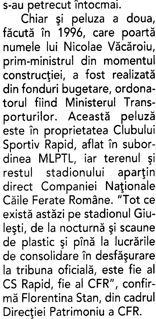 Reţineţi că nici Dinamo şi nici Steaua nu au beneficiat de măcar un cent, pentru investiţii în infrastructură. Dinamo a rămas cu stadionul (şi, de fapt, tot complexul) la nivelul anilor `50, iar Steaua a făcut investiţii serioase din banii proprii, produşi de ea (sau, a contract lucrări şi rămas datoare – vezi AVAB şi Tehnorob – dar a rămas datoare ea, CS Steaua, nu MapN). În schimb, investiţiile directe ale Ministerului Transportului, în stadionul Rapid (vizibile mai ales prin