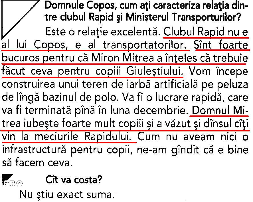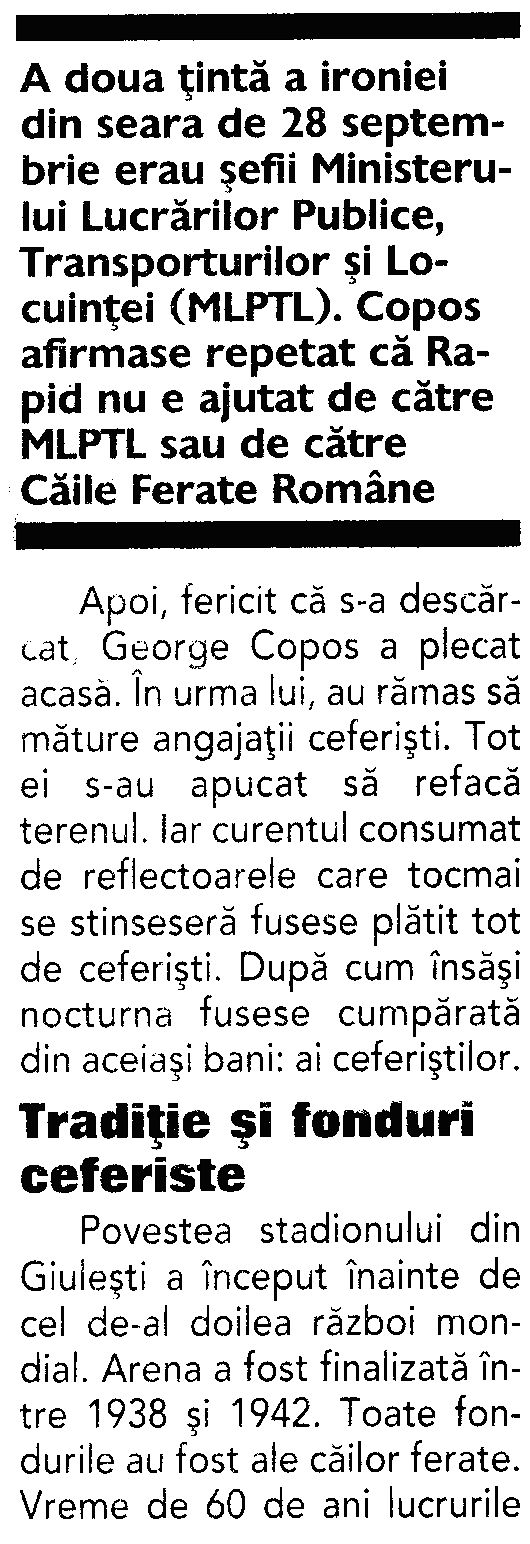 adevăraţii suporteri stelişti – care nu ştiu prea multe, când e vorba de onoarea lor de CCA-işti – şi s-ar putea să dea publicităţii un articolaş îngălbenit de ani (de la prima Mineriadă), în care domnul George Copos se exprima deosebit de interesant (culmea e că avea şi dreptate!) la adresa Clubului Rapid şi la adresa suporterilor rapidişti. Atunci să vezi câte precipitaţii de la