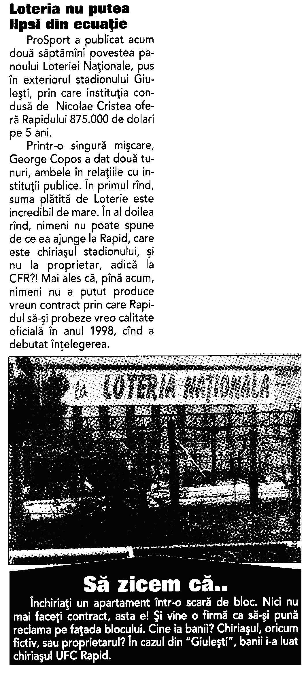 Peluza Văcăroiu, dar exprimate şi prin alte sume uriaşe, mai puţin vizibile), o fac pe Rapid cea mai mare beneficiară directă de bani publici. Pe lângă beneficiară directă, rapid a fost şi o mare sifonară de bani publici, contractând sume uriaşe (pentru acei ani) de la o Instituţie a Statului, Loteria Română.