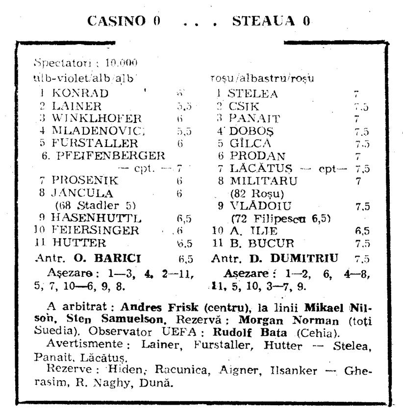 Cele 3 mari ocazii ale Stelei (Lăcătuş 43` şi 78`) şi Roşu (90`) n-au înclinat impresia în favoarea ei, cele 5 mari ocazii ale austriecilor (din care 2 bare, ale vedetei Pfeifenberger, min. 7` şi 49`) creând starea unui eşec, pentru gazde, adică a unui succes pentru Steaua (chiar dacă marea ocazie a lui Roşu, din ultimele minute ar putea sugera altfel).