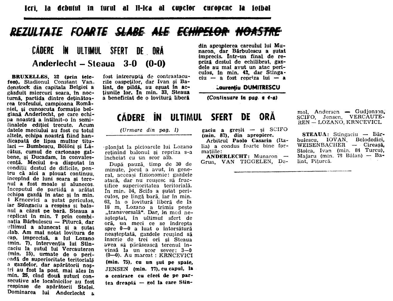 Pentru mine, asta e o infrangere dureroasa, poate cea mai dureroasa infrangere suferita in competitiile continentale ale acelor vremuri. Sa ne scoata in sezonul ce-a urmat castigarii CCE, asta n-a facut decat sa dea apa la moara celor care spuneau ca performanta Stelei a fost doar o intamplare. Plus ca ne-a scos Anderlecht, pe care-i eliminasem sezonul trecut, cu o victorie pe care o elogiem mereu.