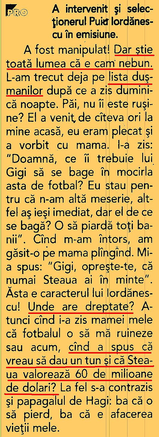 În 2003: Puiu a luat bani pentru a convoca anumiti jucatori. Daca ma da in judecata, nu trebuie sa uite un lucru: ca in instanta trebuie sa jure cu mana pe Biblie ca spune adevarul. Nu stiu daca o sa aiba curajul sa spuna minciuni. Nu o sa ma dea in judecata. Daca pune mana pe Biblie si minte, cand eu stiu ca a luat, atunci inseamna ca s-a intors lumea cu josu-n sus si eu fac puscarie cu demnitate".