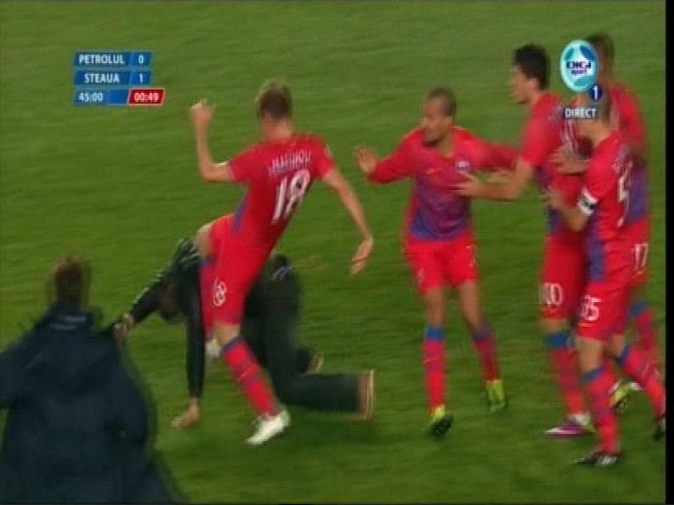 30-10-11 Petrolul - Steaua - Meci SuspendatSteaua a dat piept astăzi, 30.10.2011, cu Petrolul Ploiești, meci contând pentru etapa a 11 a, meci în care roș-albaștri încearcă să obțină prima victorie pe teren străin în acest sezon. Antrenor Ilie Stan, obligat de cel creditează clubul să obțină patru victorii din patru și să ducă echipa pe primul loc până de Crăciun, a trimis în teren următorul 11:Steaua: Stanca - Martinovici, Galamaz, Geraldo, Brandan - Bourceanu, Bicfalvi - T. Bălan, M. Costea, Cr. Tănase - Tatu Rezerve: Tătăruşanu, Fl. Costea, Latovlevici, Mustaţă, Rusescu, Năstăsie, Nikolic În timp ce Vivi Răchită a răspuns cu : Petrolul: Zimmerman - M. Tudor, Sipovici, Melinte, P. Stoica - Enescu, Bărbulescu - Fl. Dumitru, Al. Buhuşi, V. Negru - Opriţa Rezerve: Campar, Petrovici, Stomirovici, Komazec, Borza, Mitea, M. Roman II Așadar, trei ex-steliști + antrenorul din partea Ploieștenilor pe o arenă ”Ilie Oană” umplută aproape până la refuz. Prima ocazie aparține Stelei în minutul 5. Corner de pe partea stangă de atac al Stelei, lovitura este executată de Bălan, iar Geraldo trimite din 6 m în bara transversală. Un minut mai târziu, Tatu trimite puternic dintr-o lovitură liberă, însă mingea trece pe lângă poarta lui Zimmerman. Imediat jocul însă se liniștește și abia următoarea ”ocazie” vine în minutul 13, când Bicfalvi trage slab, fără nicio problemă pentru Zimmerman. În minutul 21, Dumitru execută un corner, iar Vali Negru luftează încredibil în careu, ratând o ocazie bună pentru Petrolul. În minutul 26, Tănase trimite un trasor periculos pentru spațiul aerian al Ploieștiului, iar cei de la Digi (extrem de inspirați) ni-l arată pe Ilie Stan disperat. În minutul 35, parcă din nimic, Steaua deschide scorul. O centrare de pe partea stângă cu exteriorul a lui Costea în zona cercului de 11 m de unde Bicfalvi se înalță și trimite în poarta lui Zimmerman. 1-0 pentru Steaua. În minutul 39, Brandan centrează în 6 metri de unde Geraldo lovește iarași cu capul, dar Zimmerman salvează Petrolul. Din cornerul rezultat, Martinovic lovește cu capul însă pe lângă poartă. În minutul 42, Tănase profită de o bâlbă a lui Tudor și obține un penalty pentru Steaua. Faza nu se poate derula pentru ca un dobitoc a intrat pe teren, lovindu-l în plin pe Galamaz, însă apoi a fost prins de Martinovic și restul jucatorilor Stelei și luat la bătaie. Un moment rar întâlnit. Situația o ia razna când Robert Dumitru îi elimină pe Stanca și Martinovic. O decizie absolut stupidă a lui Robert Dumitru. Nu este posibil să ai o asemenea decizie. Decizia rămâne, intră Tătărușanu în locul lui Galamaz și Nilă execută penalty-ul ”la mișto” cu o scăriță. 2-0. Steaua nu apucă să se bucure că Tătărușanu se prăbușește la pământ în urma unei petarde aruncate în spatele său. Așadar, Steaua are 2-0, doi oameni eliminați și meciul este oprit. FcSteaua.ro FCSTEAUA.RO este un site deschis, facut de suporteri, pentru suporteri. Asteptam articolele scrise de voi, daca aveti ceva de spus si credeti ca o puteti face intr-un articol, nu ezitati!