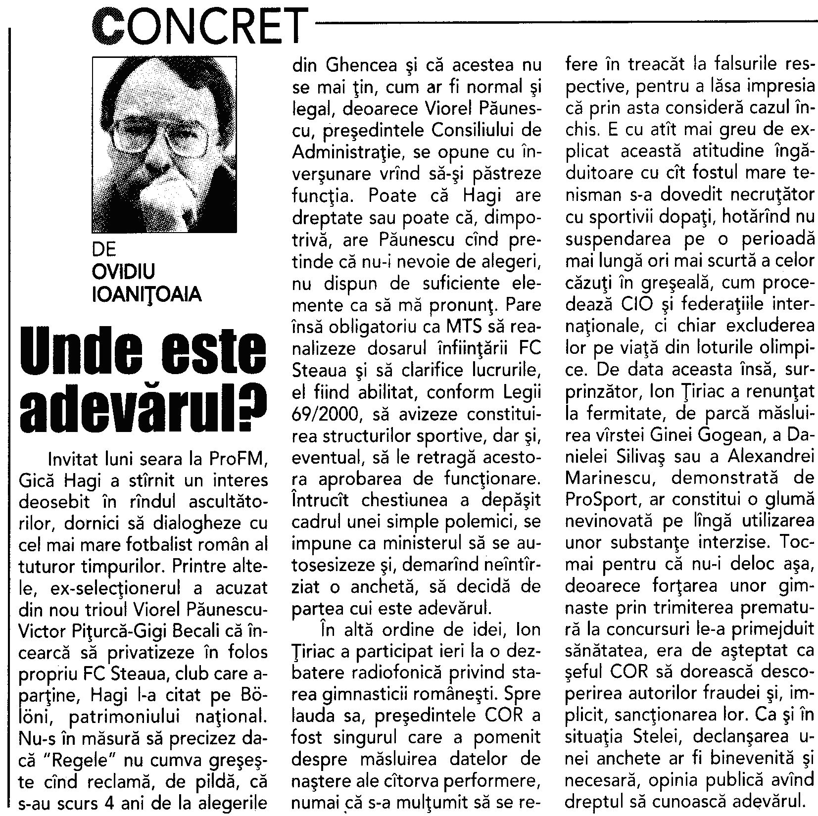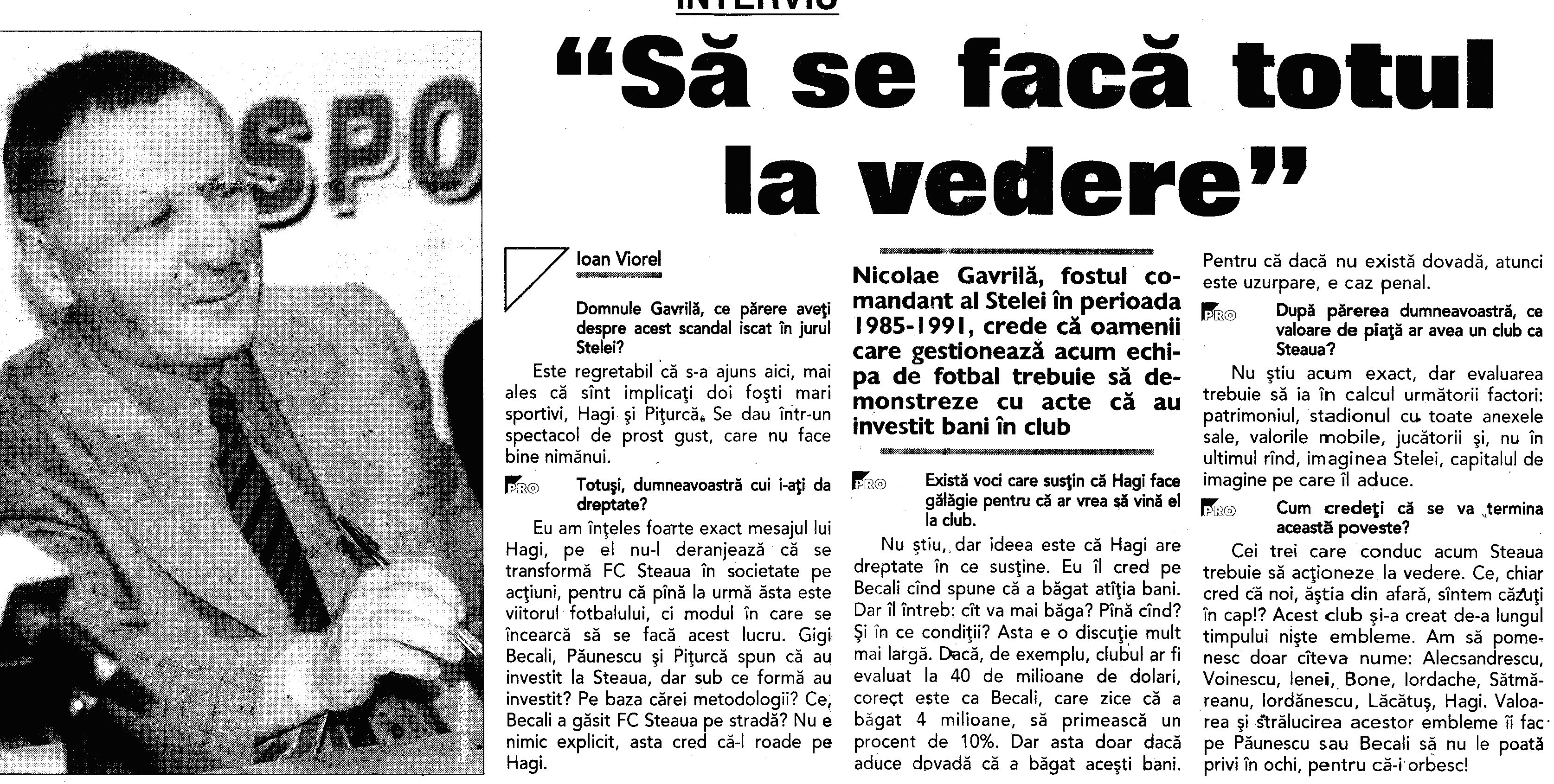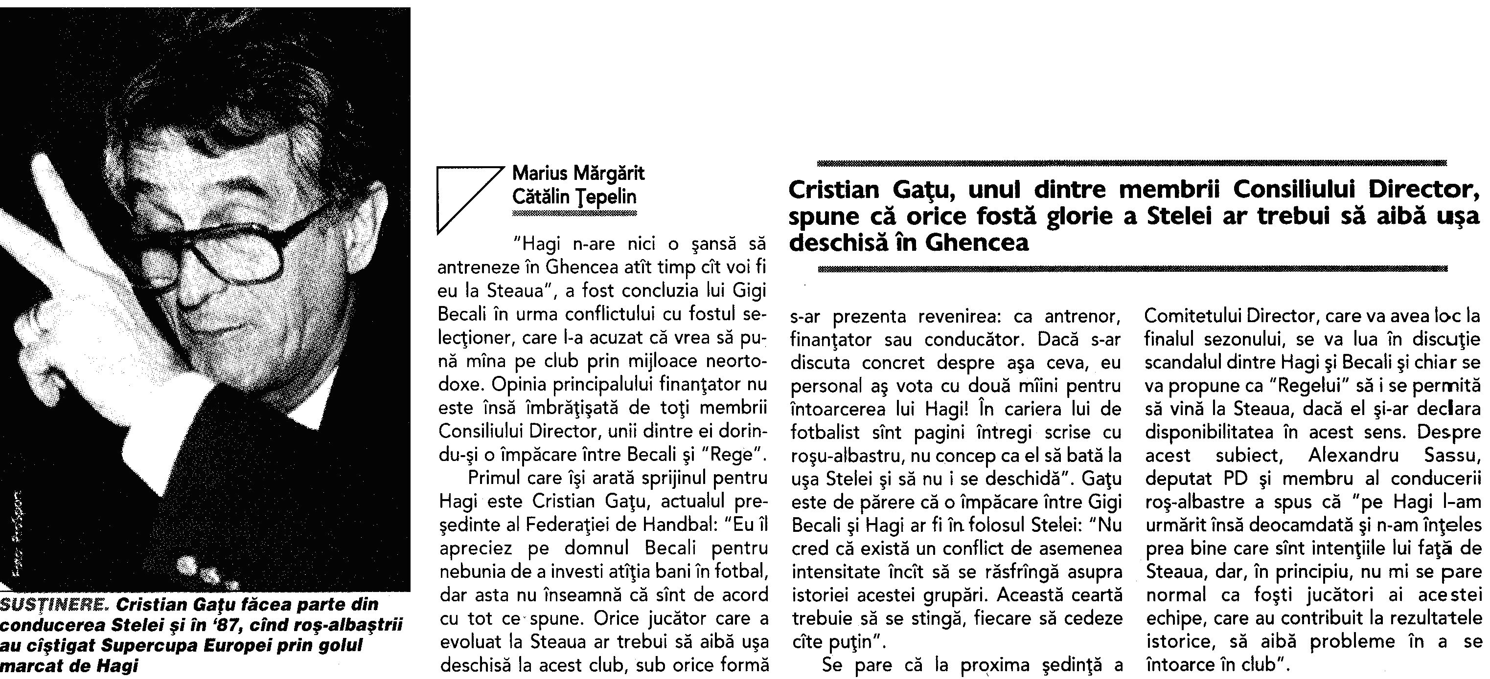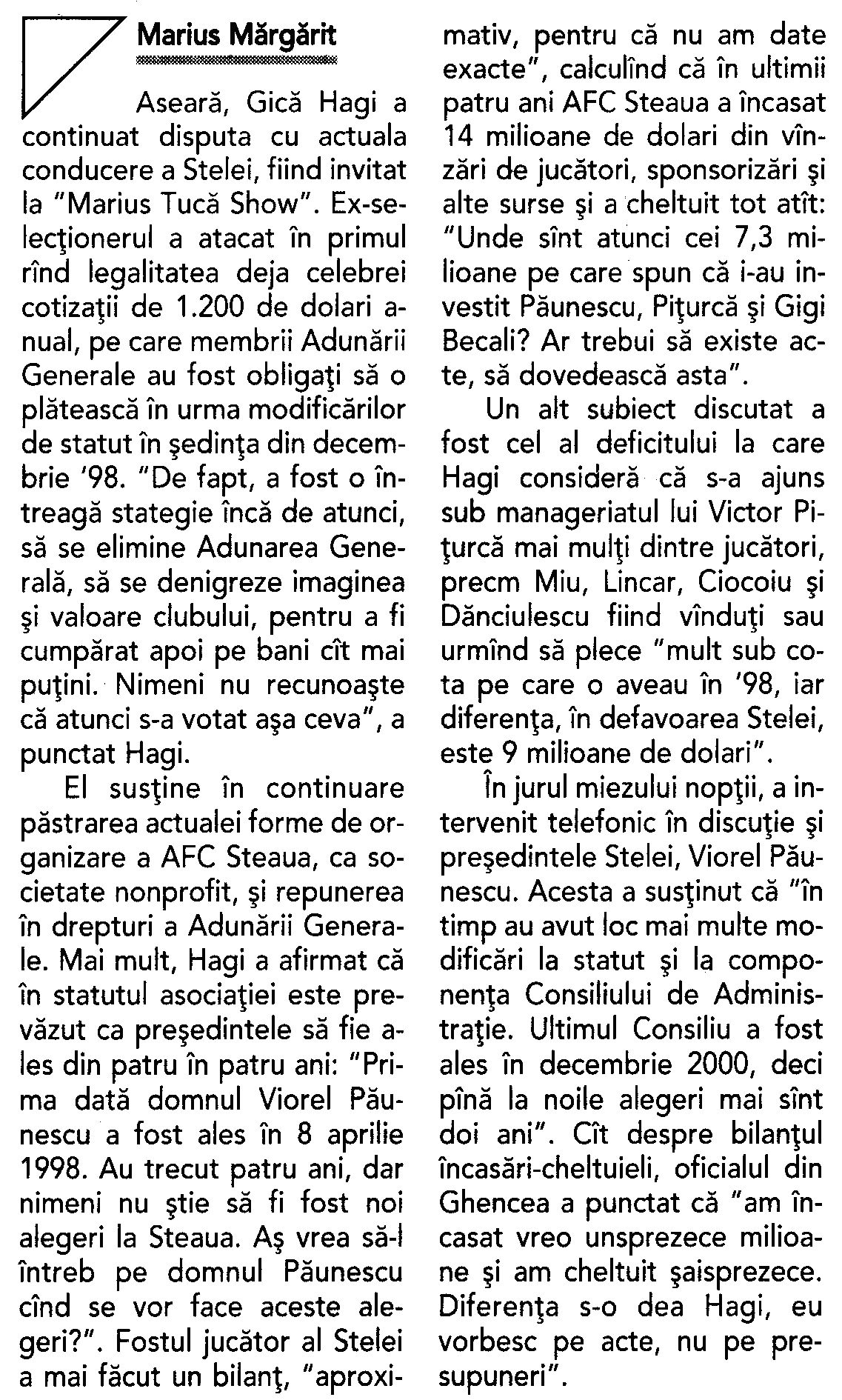 Steaua - de la MApN la Becali (15)Reluăm, după o pauză prea întinsă, expunerea cronologică a evenimentelor.Ne aflăm în primăvara lui 2002, sfârşit de martie, mijloc de aprilie. În acest episod vom continua prezentarea aspectul ieşirilor la rampă – iniţiale –, prin avertizări repetate, ale lui Gică Hagi, punctând şi o (mică) parte din modul de raportare al altora la subiect. ![]() ► Gică Hagi a atacat în primul rând legalitatea celebrei cotizaţii de 1.200 de dolari, pe care membrii Adunarii Generale au fost obligaţi s-o plătească în urma modificărilor de statut în şedinţa din decembrie 1998. ► „De fapt, a fost o întreagă strategie încă de atunci, să se elimine Adunarea Generală, să se denigreze imaginea şi valoarea clubului, pentru a fi cumpărat apoi pe bani cât mai puţini. Nimeni nu recunoaşte atunci că s-a votat aşa ceva”, a punctat Hagi aseară, la Marius Tucă Show. ► Gică Hagi susţine în continuare păstrarea actualei forme de organizare a AfC Steaua, ca societate non-profit, şi repunere în drepturi a Adunării Generale (iniţiale – n.n.). Mai mult, Hagi a afirmat că în statutul asociaţiei este prevăzut ca preşedintele să fie ales din patru în patru ani: „Prima dată, domnul Viorel Păunescu a fost ales pe 8 aprilie 1998. Au trecut 4 ani, dar nimeni nu ştie să fi fost alegeri noi la Steaua. Aş vrea să-l întreb pe domnul Păunescu când se vor face aceste alegeri!” ► Gică Hagi a mai făcut un bilanţ „aproximativ, pentru că nu am date exacte”, calculând că în ultimii 4 ani AFC Steaua a încasat 14 milioane de dolari din vânzări de jucători, sponsorizări şi alte surse, şi a cheltuit tot atât. Unde sunt atunci cei 7.3 milioane de dolari, pe care spun că i-au investit Păunescu, Piţurcă şi Gigi Becali? „Ar trebui să existe acte, să se dovedească asta!” ► Viorel Păunescu a intervenit telefonic: „în timp au avut loc mai multe modificări la statut şi la componenţa Consiliului de Administraţie. Ultimul consiliu a fost ales în decembrie 2000 (???), deci mai sunt 2 ani până la alegeri!” ► Cât despre bilanţul încasări-cheltuieli, Viorel Păunescu a spus că „am înacasat vreo 11 milioane şi am cheltuit vreo 16. Diferenţa s-o dea Hagi, eu vorbesc pe acte, nu pe presupuneri. ► Gică Hagi a considerat că sub manageriatul lui Victor Piţurcă, mai mulţi jucători – precum Miu, Lincar, Ciocoiu, Dănciulescu – au fost devalorizaţi, rezultând o diferenţă de cotă în defavoarea Stelei, între momentul 1998 şi momentul 2002, de undeva la 9 milioane de dolari (sumă puţin exagerată, dar principiu corect, acei 4 jucători tineri şi foarte tineri, internaţionali, putea fi vânduţi, la momentelor lor maxime, cu o sumă totală care ar fi ajuns la cel puţin 5-6 milioane peste ce a primit Steaua, în momentul despărţirii – n.n.) ![]() În următoarele 3-4 episoade, vom căuta să închidem prezentarea anului competiţional (nu calendaristic!) 2001-2002, prin prezentarea tematică a unor aspecte legate de modul de raportare al suporterilor, modul de raportare al presei (editoriale ale unor formatori de opinie), contextul strict sportiv (performanţe, administraţie, buget, dar mai ales imagine), circul care devenise „Steaua şi Gigi Becali”, majoritatea subiectelor fiind circumstanţiate conştiinţei publice în legătură cu toată seria de transformări, profunde, complexe şi rapide, prin care trecea clubul Steaua, fără o legătură directă cu „privatizarea”, dar cu largi semnificaţii în înţelegerea contextului şi fondului pe care a fost ea posibilă. Filip Pindean Steaua - de la MApN, la Becali (1) Steaua - de la MApN, la Becali (2) Steaua - de la MApN, la Becali (3) Steaua - de la MApN, la Becali (4) Steaua - de la MApN, la Becali (5) Steaua - de la MApN, la Becali (6) Steaua - de la MApN, la Becali (7) Steaua - de la MApN, la Becali (8) Steaua - de la MApN, la Becali (9) Steaua - de la MApN, la Becali (10) Steaua - de la MApN, la Becali (11) Steaua - de la MApN, la Becali (12) Steaua - de la MApN, la Becali (13) Steaua - de la MApN, la Becali (14) FCSTEAUA.RO este un site deschis, facut de suporteri, pentru suporteri. Asteptam articolele scrise de voi, daca aveti ceva de spus si credeti ca o puteti face intr-un articol, nu ezitati!