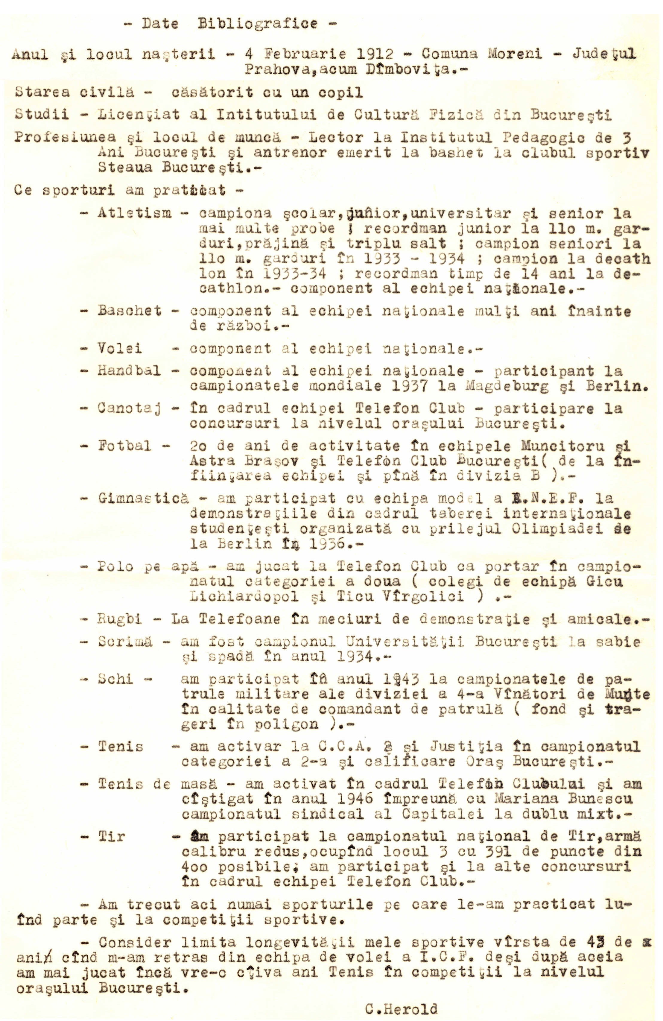 Legenda lui Costi Herold„În cele ce urmează, veţi constata urmările unei misiuni dintre cele mai grele: zugrăvirea unui om cu însuşiri excepţionale.”Introducerea făcută de Dostoievski explică întru-totul şansa în faţa căreia ne aflăm şi inhibă orice nevoie de mai adăuga ceva. Astăzi, 4 februarie 2012, suporterii stelişti aniverseaza 100 de ani(n. 4 februarie 1912 – d. 28 august 1984) de la naşterea unei personalităţi absolut unice din istoria sportului românesc şi din istoria clubului Steaua. ISTORIA SPORTULUI ROMÂNESC cuprinde în filele nostalgicelor sale începuturi dar, în mod deosebit, în anii de după ultimul război, multiple realizări şi performanţe excepţionale, în dreptul cărora rămîn înscrise pentru totdeauna cu majuscule numele unor mari personalităţi dintre acelea ce dau culoare unei epoci şi lumină viitorului. Campioni, recordmeni, internaţionali. Valori individuale dimensionate la scara unor cerinţe care au atins de multe ori graniţele superioare ale măiestriei şi pe alocuri ale perfecţiunii. Intre aceştia se numără un sportiv în cel mai cuprinzător sens al cuvântului, figură de legendă, plăsmuită din fericita simbioză a însuşirilor dăruite de natură cu munca aspră şi perseverentă a celor obişnuiţi să nu cunoască piedici în calea succesului. Era uşor de recunoscut după statura sa impunătoare, după chipul cu trăsături viguroase, după mersul drept de gimnast şi privirea calda, învăluitoare, prietenoasă, dar care-ţi impunea totuşi un sentiment de deosebită consideraţie şi stimă. ![]() In vacanta, alaturi de fiica si un nepot Îl întîlneai la fel de liniştit şi calm pe stradă sau la catedră, în faţa studenţilor săi, spectator în tribună sau pe banca antrenorului, acolo unde tensiunea meciului atingea cote maxime. Un om echilibrat, sobru în toate manifestările sale cotidiene şi impresionant de modest, virtuţi care îi caracterizează pe cei demni de o preţuire adevărată. Acesta a fost Constantin Herold, sportivul de ieri care şi-a cucerit o faimă binemeritată practicînd în competiţii oficiale de-a lungul unui sfert de veac nu mai puţin de 14 discipline sportive. Acesta a fost profesorul, antrenorul şi cetăţeanul, exemplu de pricepere şi conştiinciozitate în muncă, pedagog înzestrat şi experimentat în educarea multor promoţii de tineri îndrăgostiţi de mişcare şi de arta mînuirii cu iscusinţă a mingii. Pentru toţi cei din preajma preocupărilor sale obişnuite: „nea Costi" sau numai „Costi”; pentru toţi cei care au crescut în sport sub ochii lui şi au „furat” cîte ceva din exprimarea plină de măiestrie a însuşirilor sale: „Unchiul", apelativ de o familiaritate seducătoare simbolizând, în nuanţa gingaşă a „înrudirii”, respectul vîrstei şi al valorii. Din muncă aspră se făuresc valorile Constantin Herold s-a născut la 4 februarie 1912 la Moreni, pe atunci o aşezate mică dar vestită prin bogăţia aurului negru ascuns în adîncurile pămînturilor sale. (Provine dintr-o familie cu origini socio-etnice interesante. Tatăl său, Iosif Herold, născut la Braşov în 26 martie 1884, într-o familie de religie reformată, era de origine austro-ungară. Mama lui Iosif, Gal Rosalia – bunica lui Costi – era unguroaică, iar familia tatălui său venise din Austria şi se stabilise în zona Braşovului şi Făgăraşului. Soţia lui Iosif Herold – mama lui Costi –, se numea Maria-Smaranda Stoica, născută în 1890 în comuna Colibaşi, jud. Dâmboviţa. Avea doar 16 ani când Iosif a furat-o şi a dus-o la părinţii lui, la Braşov, pentru a se căsători cu ea. Familia ei nu voia s-o lase să se mărite cu un „străin” (Transilvania făcând parte din Imperiul Austro-Ungar), drept pentru care au dezmoştenit-o când s-a produs căsătoria. Tânăra familie Herold a revenit în Regat, stabilindu-se la Moreni, unde s-au născut 4 copii până în 1916, (din cei 6 avuţi împreună, toţi fiind botezaţi în religia ortodoxă). La doi ani de la începutul Primului Război Mondial, în 1916, România a intrat în război împotriva Austro-Unagriei, iar tatăl lui Costi, deşi căsătorit şi cu 4 copii, dar fiind supus austro-ungar, a fost trimis într-un lagăr de prin zona Vasluiului, în Moldova. Bunurile familiei au fost confiscate, mama lui Costi împreună cu cei 4 copii au plecat după Iosif, au supravieţuit războiului şi unei epidemii de tifos-exantematic, şi au revenit la Moreni la sfârşitul războiului, luându-şi viaţa de la capăt. Tatăl lui Costi a fost naturalizat, primind cetăţenie română. Costi (Constantin, cum era trecut în certificatul de naştere) a fost cel de-al treilea copil al familiei Iosif şi Maria-Smaranda Herold, înaintea lui venind pe lume Ilie (1908) şi Gheorghe (1910), urmându-i un alt Gheorghe (născut în 1914, ajuns colonel de Armată), Maria-Despina (1918) şi Victor (1928). (Informaţii obţinute prin bunăvoinţa fiicei lui Costi Herold, Elena – n.n.) A început să facă sport la o vîrstă cînd încă nu desluşise bine la şcoală rostul primelor litere din abecedar. Fotbalul a fost bineînţeles pasiunea debutului, iar mica asociaţie M.A.T.I.L.U.S (Mingea atrage tinerii intelectuali la uzul sportiv), leagănul celor dintîi visuri de jucător. A devenit apoi cunoscut în comună, la 10 ani, participând pentru prima oară la un mini-concurs de atletism şi cîştigînd toate cele 5 probe la care s-au organizat întreceri: aruncarea greutăţii (în realitate o simplă bucată de fier), săritura în lungime şi înălţime, alergări de viteză şi rezistenţă (cca 600-700 m, în jurul unei grădini). A urmat apoi un popas scurt la liceul „Petru şi Pavel” din Ploieşti; primele două clase în şcoala unde mai învăţau şi fraţii săi mai mari şi apoi la internatul profesorului Dumitriu, în curtea căruia are prilejul să-şi înc