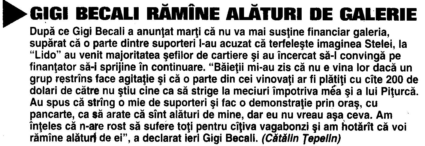 Ti-am explicat foarte clar ca nu-i condamn! Poate ii si inteleg. Dar daca erai golgheterul Stelei, puteai sa-i ceri impresarului dinamovist sa te duca pe undeva pe-afara, nu? Ca nu era el om de Bistrita sau Ceahlaul... Dar el a preferat calea mai usoara, sa joace la Dinamo unde sa devina golgheter pe baza unor meciuri dubioase (ca sa nu zic mai mult), si sa fie vopsit din cand in cand de Giovani pt. un transfer afara, sa le aduca malai, apoi dupa 6 luni sa se-ntoarca.