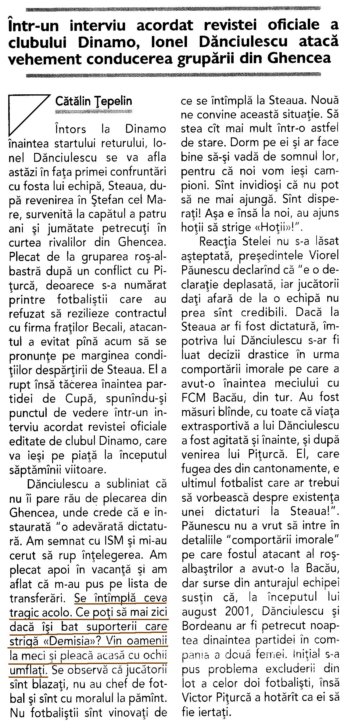 Multi dintre voi ati uitat probabil ca Danciulescu fusese la Dinamo inainte de a fi la Steaua...ca marcase si pt. aia contra Stelei...nu gol important, dar tot gol era. Punk vine si ne spune ca raspundea la salutul galeriei steliste dupa ce semnase iar cu Dinamo, dar eu il intreb cand anume? Dupa 2003 cand deja se impacase cu aia, sau intre 2002-2003 cand aia il injurau la fiecare meci si saracu' nici el nu mai stia unde va juca in viitor...