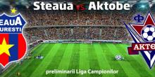 06-08-14 Steaua-Aktobe 2-1. Campionii in playoff!"Steaua Bucuresti, campioana Romaniei, s-a calificat miercuri seara in playoff-ul Ligii Campionilor, dupa ce a invins pe Aktobe, cu 2-1, in mansa retur de la Bucuresti. Prin acest rezultat Steaua si-a asigurat prezenta in grupele Europa League, dar miza cea mare va fi patrunderea in grupele Ligii Campionilor pentru al doilea an consecutiv. Steaua isi va afla adversara din playoff vineri, de la ora 14:00.Lucian Sanmartean a ratat astfel prima ocazie a meciului, sutand putin pe langa poarta in minutul doi al meciului. Jocul s-a mutat rapid in careul Stelei si Latovlevici a respins cu capul intr-o situatie care se anunta periculoasa pentru poarta lui Arlauskis. Steaua a deschis scorul in minutul 3 prin Chipciu la capatul unui contraatac initiat de Popa inca din propria jumatate. Acesta a patruns cu mingea la picior in careul advers si a intors pentru finalizarea lui Chipciu. Gilca a fost nevoit sa mute dupa zece minute de la deschiderea scorului, mijlocasul Sanmartean acuzand o durere in zona toracica. In locul acestuia a intrat Filip si sub adapostul scorului de pe tabela devenise clar ca Steaua va incerca sa conserve rezultatul. In minutul 31 portarul Arlauskis a iesit la rampa cu o prima interventie salvatoare. Popa a incercat sa trimita inapoi catre propriul portar, a trimis prea slab si Antonov a interceptat ramanand intr-o pozitie de unu contra unu cu Arlauskis. Acesta a reusit sa blocheze spre disperarea lui Vladimir Gazzayev, antrenorul oaspetilor. Steaua a profitat si cu cinci minute inaintea finalului primei reprize Stanciu a reluat spectaculos fara preluare din centrarea lui Chipciu. Un gol venit la momentul potrivit pentru a taia elanul kazahilor. Aktobe nu s-a predat si Arlauskis a mai intervenit o data pana la pauza blocand decisiv in doua randuri facandu-l uitat pe Ciprian Tatarusanu. Echilibrul numeric s-a rupt la sapte minute de la reluarea jocului Logvinenko fiind eliminat dupa un fault din spate comis asupra lui Filip. In minutul 61 Steaua a ratat prima ocazie a partii secunde la o centrare in careu pentru Chipciu. Acesta a plutit pur si simplu pentru intalnirea cu balonul si nu mult a lipsit sa se ciocneasca violent de bara portii celor de la Aktobe. Pe masura apropierii finalului meciului Steaua a inceput sa joace la rezultat si sa tina mai mult de minge. Doar suturile trimise de Latovlevici (76) si Filip (80) au mai dezmortit tribunele, insa ultimele cinci minute aveau sa fie cu adevarat tensionate. Aceasta datorita sau din cauza, depinde din ce unghi privim situatia, golului marcat de Kapadze in minutul 85. Un gol venit din senin si pe fondul unei noi inexactitati in apararea Stelei. Latovlevici a deviat pe spate pana la adversarul sau si Kapadze a gasit un culoar prin care a trimis in poarta lui Arlauskis. Steaua: Arlauskis - Râpă, Szukala, Varela, Latovlevici - Prepeliţă, Sânmărtean (Filip '12) - Popa, Stanciu (Iancu '48), Tănase (Pîrvulescu '81) - Chipciu. Antrenor: Constantin Gâlcă. FK Aktobe: Sidelnikov - Miroşnicenco, Arzumanian, Logvinenco, Anderson Mineiro - Danilo Neco, Korobkin, Tarikaiev, Kairullin (Kapadze '60) - Antonov (Almbetov '68), Pizzelli (Şabalin '80). Antrenor: Vladimir Gazzaev. Cartonaşe galbene: Chipciu '6, Latovlevici '68 / Mineiro '11, Logvinenco '23, '56 Korobkin '35 Cartonaş roşu: Logvinenco '56 Meciul a fost arbitrat de o brigadă din Cehia, cu Miroslav Zelinka la centru. Zelinka a fost ajutat la cele două linii de Antonin Kordula şi Jan Patak, în timp ce rezervă a fost Zbynek Proske. Delegatul UEFA a fost elveţianul Rene Eberle, în timp ce observatorul de arbitri spaniolul Manuel Enrique Mejuto Gonzalez. La partidă au asistat 24.430 de spectatori." Sursa: onlinesport.ro Declaratii dupa meci Costel Galca: “E un rezultat foarte important pentru noi, ne-am asigurat calificarea in Europa League. Dar noi speram sa ajungem in Champions League. Am intalnit o echipa foarte agresiva, am incercat sa evoluam cu jucatori care au intensitate sus, ca Stanciu si Chipciu, si in multe momente din meci, ne-a reusit. La Sanmartean a fost o lovitura in coasta, la Stanciu, o talpa pe glezna. Chipciu, daca se dezbraca, are numai semne pe corp. A fost un joc foarte dur din partea adversarilor." Vladimir Gazzaev: "Felicit echipa Steaua pentru calificare. Este echipa mai puternică. S-a văzut clar după cele două meciuri. În unele momente nu am avut noroc, ne-a lipsit experienţa, dar Steaua a meritat să meargă mai departe pentru că este mai puternică. În prima repriză echipa a intrat emoţionată şi a rămas aşa după primul gol încasat repede. În a doua repriză am jucat mai bine, dar din păcate nu suntem la nivelul Stelei. Am avut ocazii de a marca însă nu au fost concretizate. La un meci de asemenea nivel trebuie să înscriem la fiecare ocazie. Vom ţine cont de greşelile de azi pentru a nu le mai repeta. După aceste două meciuri rămând la părerea că am o echipă bună, cu un viitor frumos" Anghel Iordănescu: "A fost o primă repriză de excepție, care ne-a încântat. Au fost câteva momente de neatenție și le-am oferit mingea, dar am avut un portar la fel de inspirat ca și echipa, un joc bun și eu cred că trebuie să îi felicităm pe jucători, pe Costelino, pentru că este un rezultat bun, o victorie și o calificare pe deplin meritată. Sunt convins că în jocul Stelei din repriza a doua a intervenit și relaxarea. Asta ne-a costat și golul din final. Steaua e echipa care face față la nivel internațional și nu trebuie să ne facem griji" Reactii in presa Florin CARAMAVROV - Prosport "Marea echipă a Stelei Steaua este echipa care ne scoate sezon de sezon în Europa, ne face cunoştinţă cu elita continentală, ne poartă pe mari stadioane ale lumii, chiar dacă, de multe ori, se vede că are lacune, că îi lipseşte, de fiecare dată,câte ceva. În momentele astea, nu mai trebuie să ne gandim la manelismele din conducerea Stelei, actuala inchi