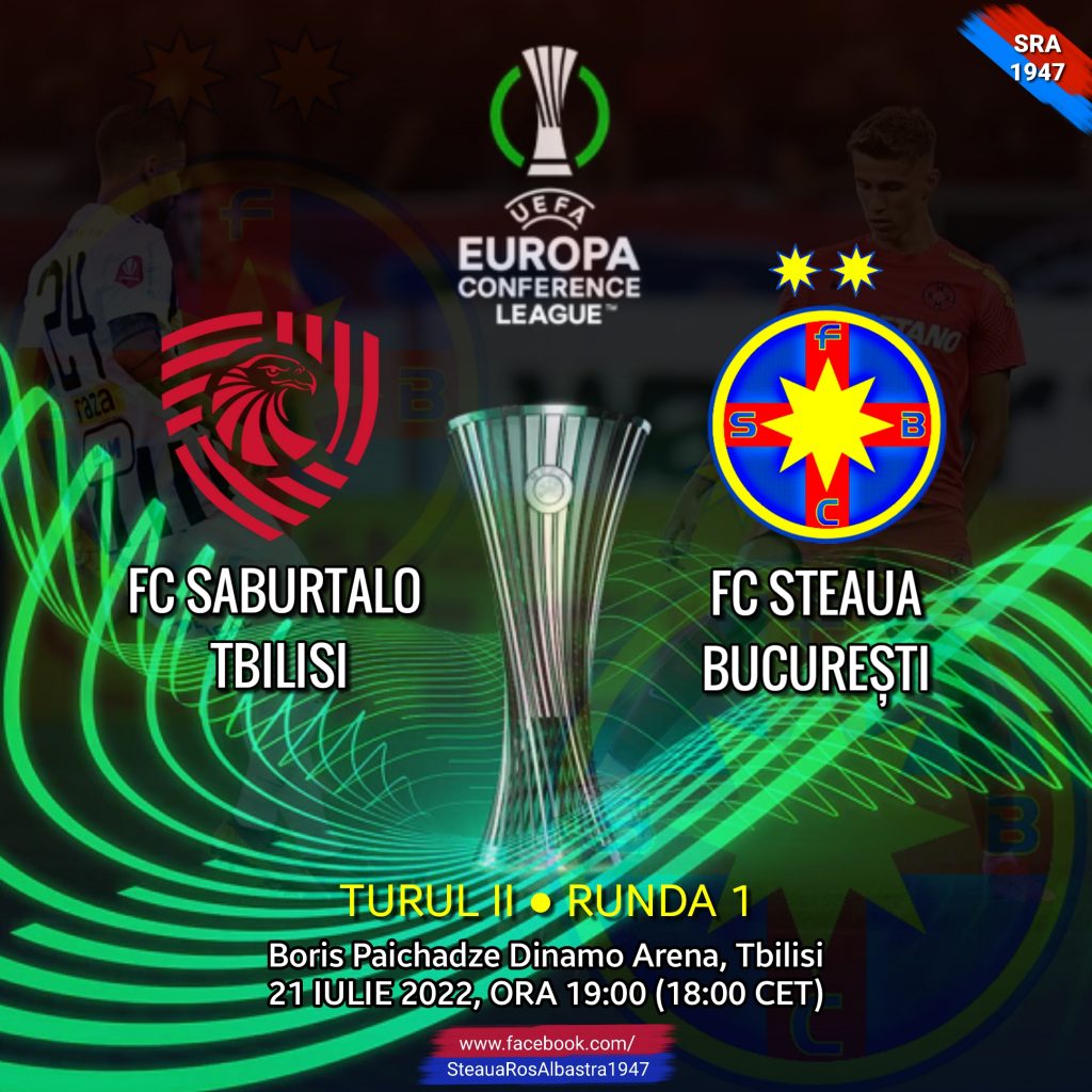 ⚽️?FC Steaua va evolua direct în turul secund de UEFA Conference League într-o dublă manșă împotriva echipei FC Saburtalo Tbilisi din Georgia. Roş-albaştrii vor debuta în competiţia europenă în data de 21 iulie, pe stadionul „Boris Paichadze Dinamo Arena”, din Tbilisi, urmând ca returul să-l dispute în București pe Arena Națională o săptămână mai târziu, pe 28 iulie 2022.